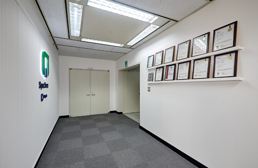 입구부터 찬찬히 둘러보면서 동선을 따라 김포 한강 르네상스 비즈나인 지식산업센터 인테리어를 설명드리겠습니다. 들어오자마자 보이는 아트월은 템바보드 형식이 적용되었으며 후면에 조명이 매립된 로고가 부착되었습니다. 흰바탕이라 컬러로고가 더욱 돋보이고, 바닥은 카펫재질로 어두운 색상이지만 너무 차갑게 느껴지지 않도록 중화하였습니다.