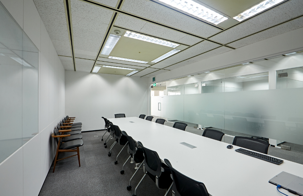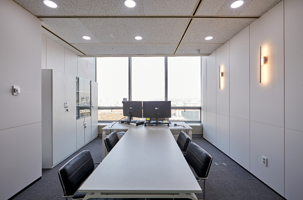 CEO룸은 깔끔한 인테리어로 연출하였는데요. 중앙에는 소규모 미팅이 가능한 테이블이 놓여졌고 창가쪽에 테이블을 배치하여 T형태로 구성하였습니다. 그리고 벽면에 벽등을 매립하여서 고풍스러운 분위기를 내고 맞춤 장을 설계하였는데요. 벽면과 비슷한 스타일로 눈에 튀지않고 정돈된 느낌이 듭니다.