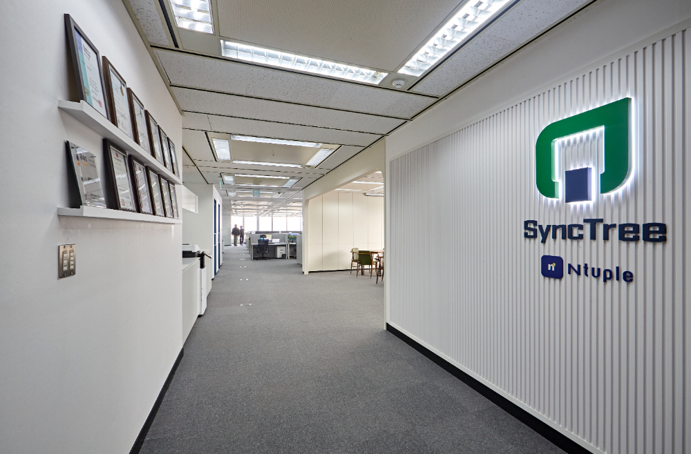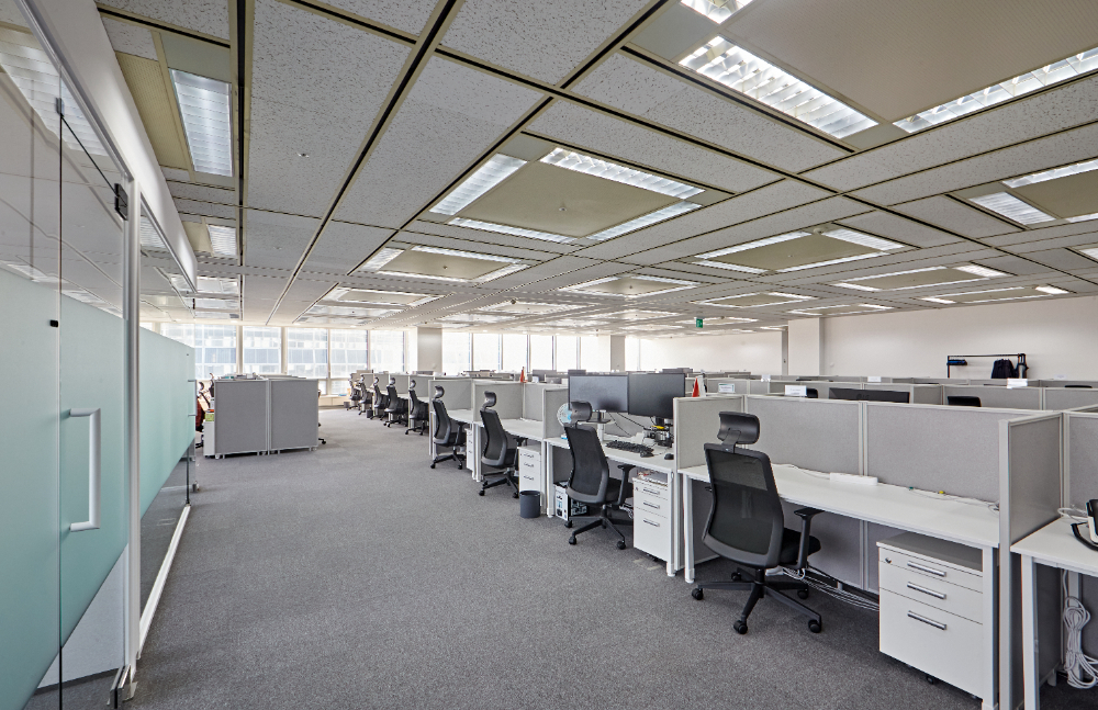 그렇게 내부로 들어서면 광활한 오피스의 모습을 마주할 수 있는데요. 천장의 구역과 아래의 구역이 일치하도록 균일한 배치를 두었으며, 각 테이블마다 파티션을 그레이 컬러로 통일하였습니다. 그리고 규칙적인 배열을 통해서 정돈된 느낌을 주도록 노력했습니다.