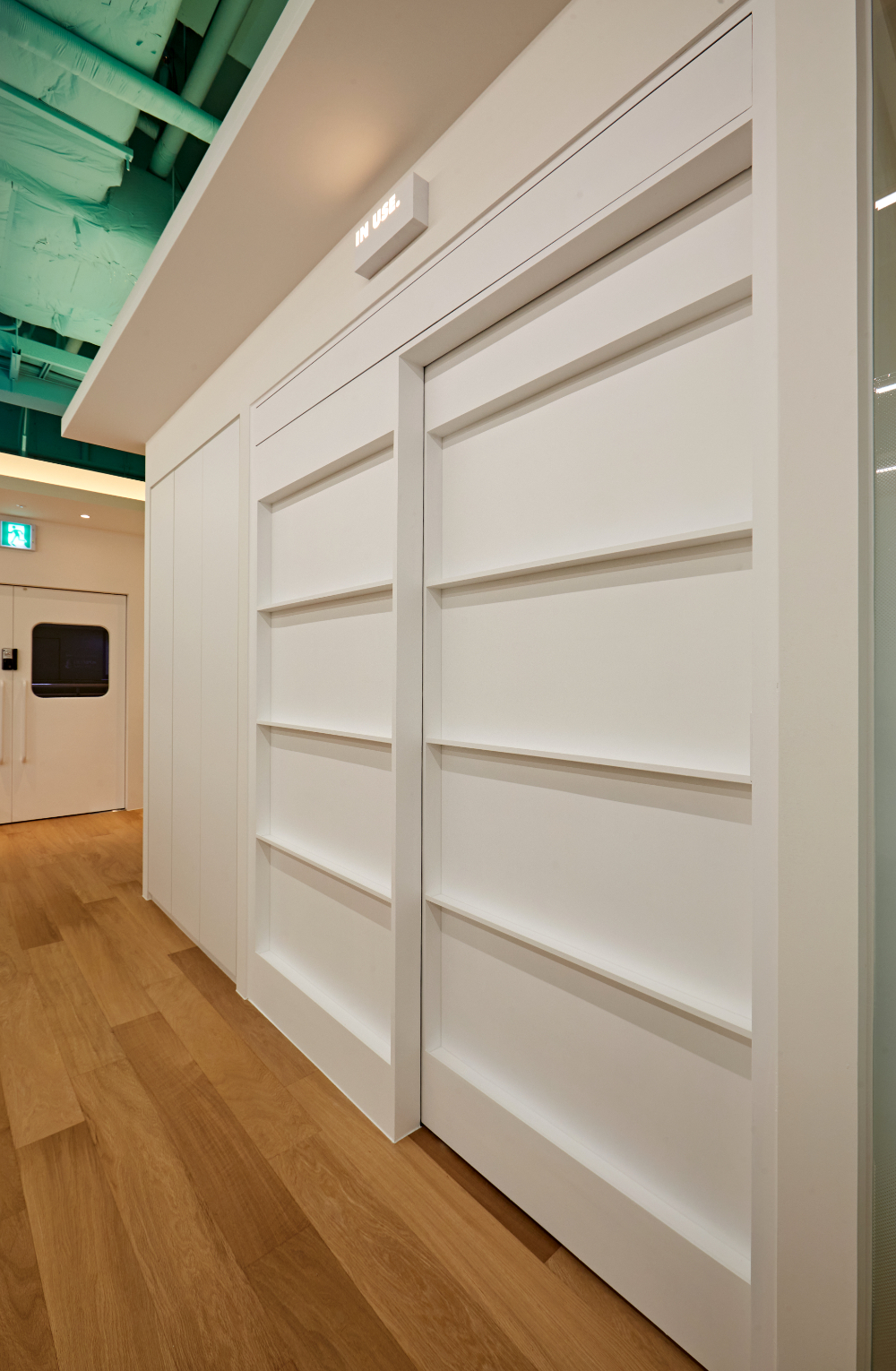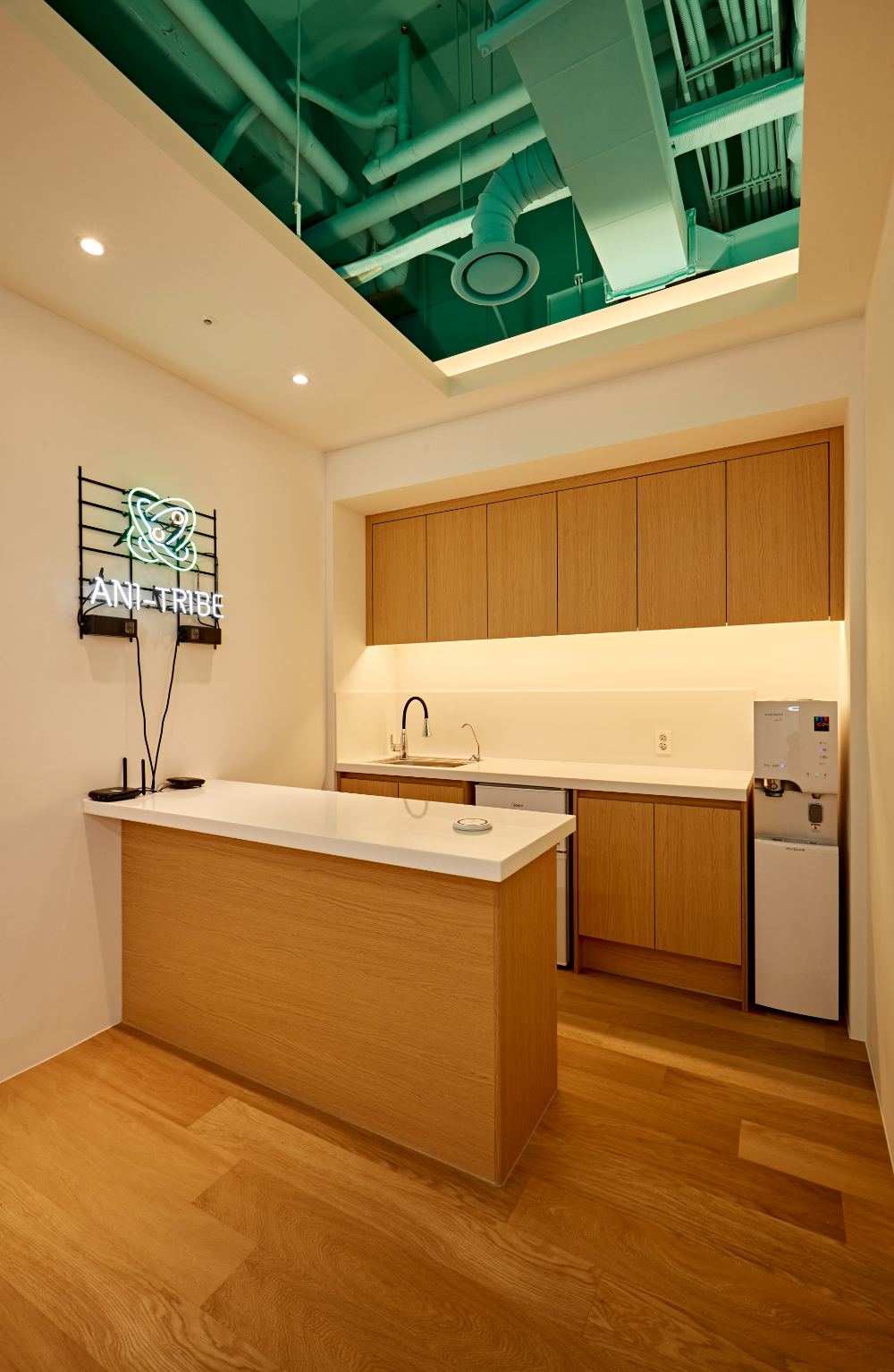 그리고 노출형 천장에는 컬러 포인트 뿐만 아니라 구조를 따라 입구에서부터 가장 안쪽까지 일자형 조명도 설치가되어 있습니다. 일자형 조명으로 공간이 더 깊고 넓어 보이는 효과도 생겼습니다.