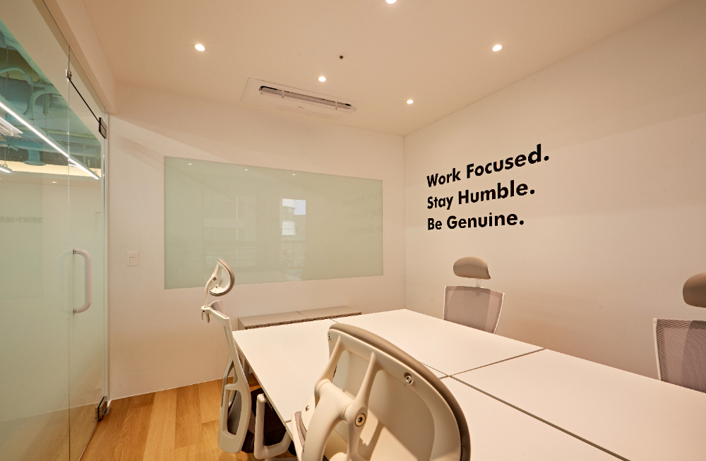 내부 공간은 평수가 넓지는 않지만 글라스월과 정면에 통창이 있어 답답함이 느껴지지는 않습니다. 메인 업무 공간에서 사용된 동일한 오피스 가구를 배치했고 벽면에는 백페인팅 글라스로 효율성을 높였습니다.