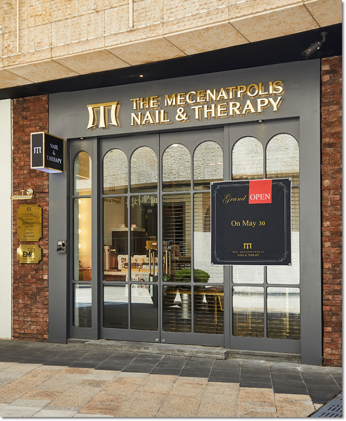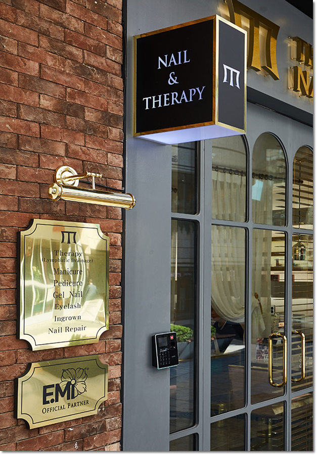 네일샵 출입문의 모습입니다. 전제적으로 색의 조화를 통해서 배치를 해보았으며 블랙톤의 색감과 금색의 인테리어 디자인을 통해서 출입문을 조금 더 고급진 인테리어 디자인이 형성이 되었습니다. 출입문의 외벽 같은경우에는 유리 외벽을 이용해서 배치를 하였으며 유리에 있는 틀 같은 경우에는 상호에서 사용이 된 색감을 사용해서 현대적이면서도 유럽풍한 네일샵의 출입문이 완성이 되었습니다.