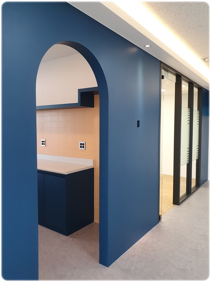 탕비실 공간은 도어가 없는 아치형 가벽으로 분리했고 내부에 화이트, 블루를 적용해 통일성을 주었으며 무지주 선반, 세련된 수전, 4구 콘센트 등을 계획해 사용성과 편의성을 높였습니다.