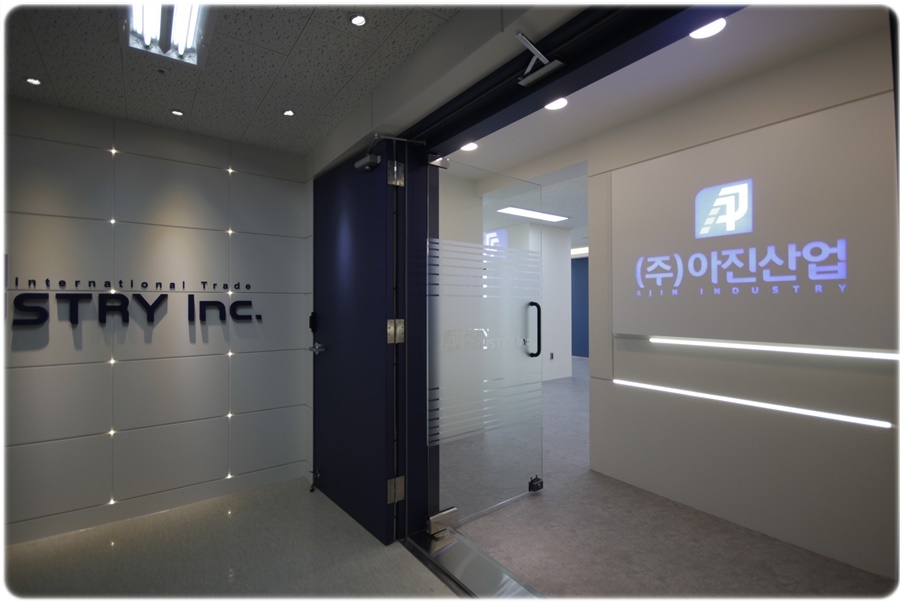 내부로 들어가면 오픈형으로 조성된 공용 사무공간이 나오고 벽면에는 사인물로 제작한 슬로건과 비전을 시공해 회사 정체성을 높였습니다. 익스테리어에 사용된 화이트와 블루를 적용해 통일성을 이뤘고 바닥은 그레이톤을 적용해 차분하면서 집중력을 높일 수 있도록 했으며 손상이나 오염에 강한 소재로 마감해 사용성을 높였습니다.
