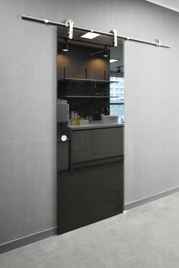 회사 사무실 안족 공간에 위치하고 있는 곳으로 브론드 유리로 도어를 설치한 슬라이딩 도어 입니다.