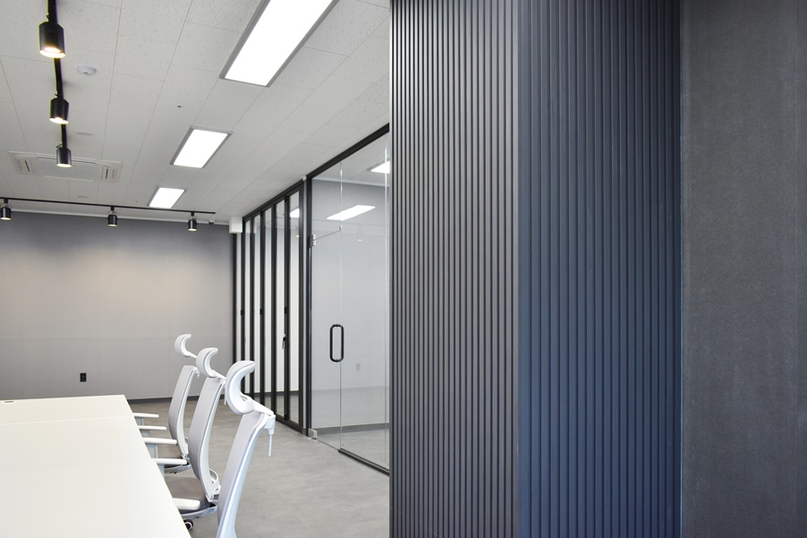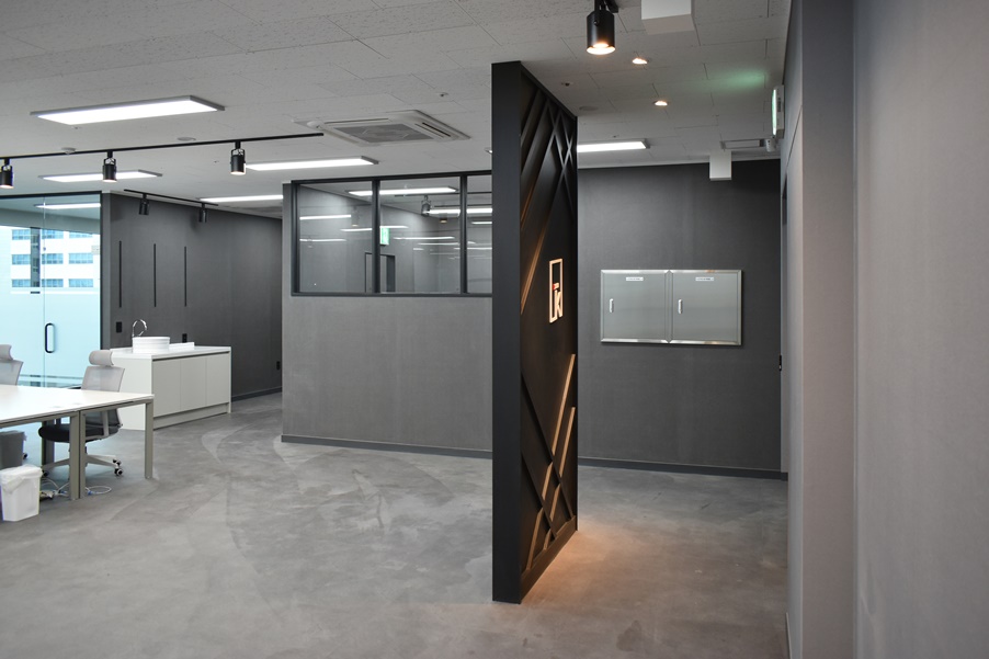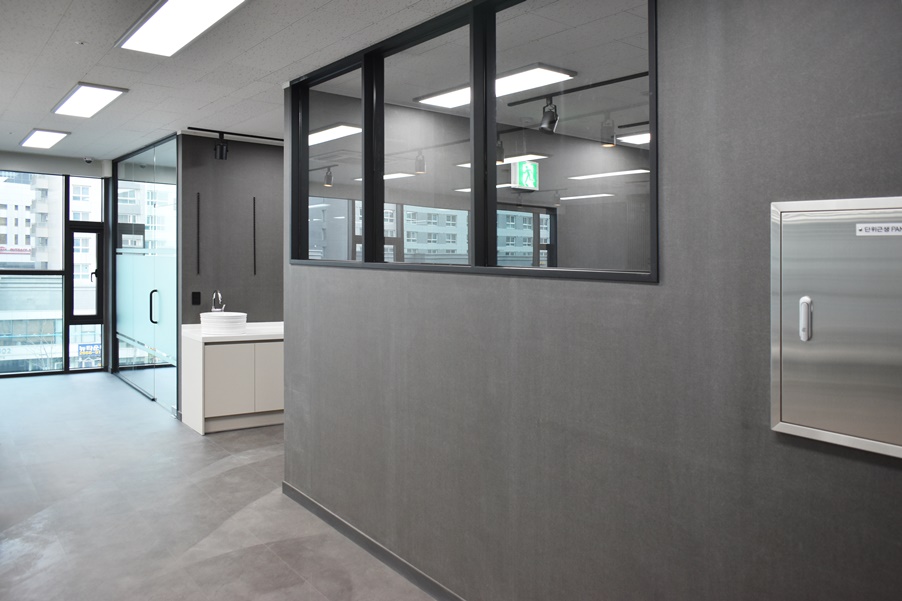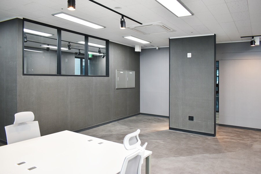 사무실 벽면은 그레이 컬러로 통일감 있게 시공하여 더욱더 깔끔한 분위기를 보여주고 잇습니다.