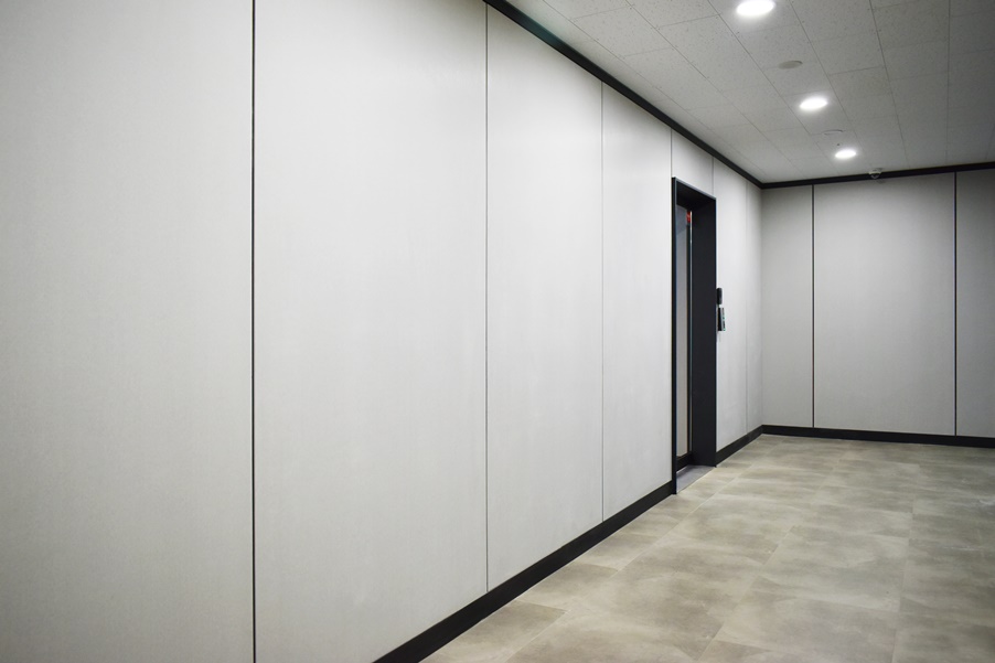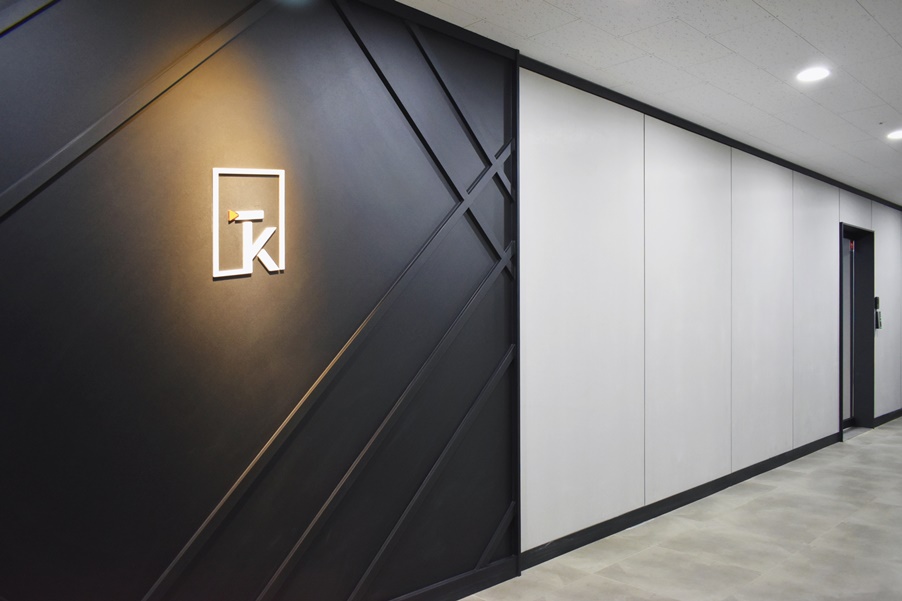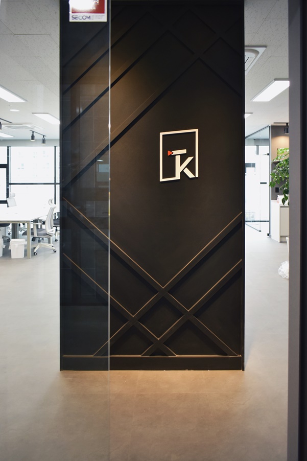 회사 사무실 출입문 공간은 깔끔한 디자인으로 시공하였으며 짙은 그레이 컬러를 라인에 더하여 전체적인 밸런스를 맞추었습니다.
