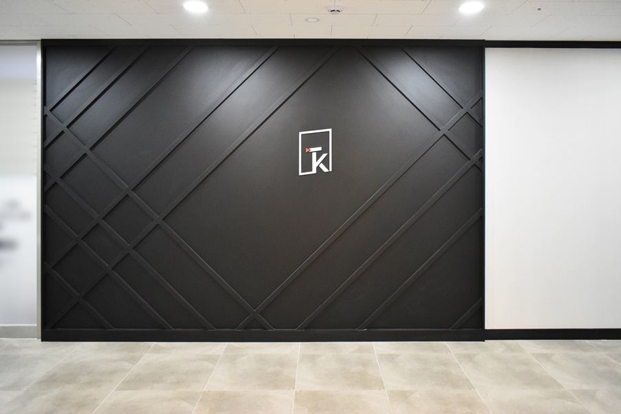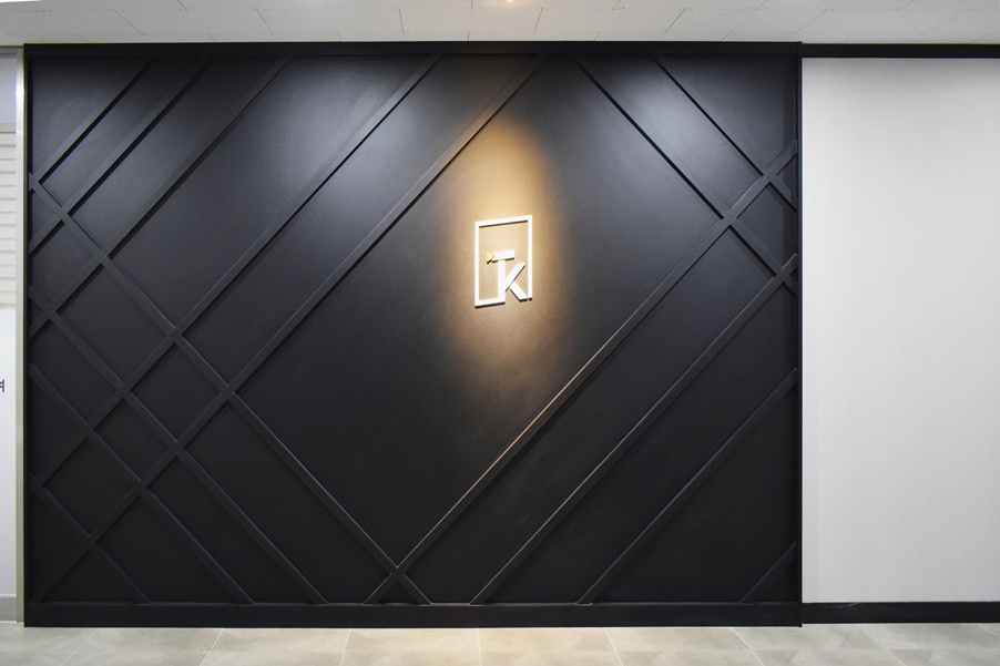 앞서 제일 처음 보여드린 회사 로고가 들어간 파티션입니다. 회사 출입구에 위치하고 있는 곳으로 따스한 간접 조명이 공간을 비추고 있어 아늑해 보입니다.