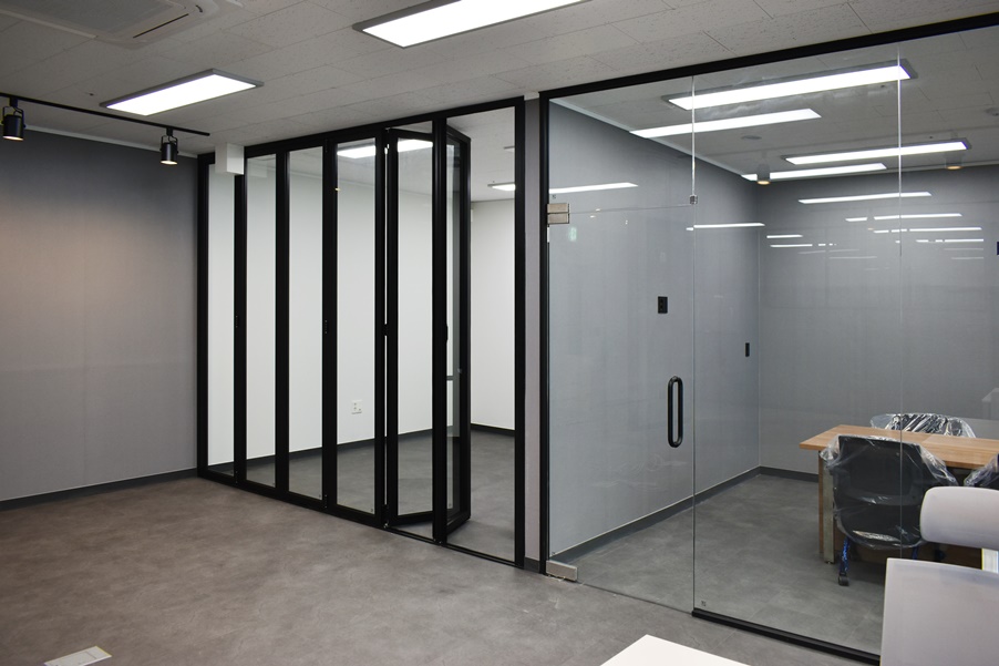 개별 공간의 한쪽 부분은 폴딩도어를 설치하여 공간의 효율성을 높여 드렸습니다. 도어를 접었다 펼 수 있어 자유롭게 사용이 가능하여 매우 실용적인 남양주 별내 에이스하이엔드타워, 100평 120평 대형평수 사무실 인테리어 입니다.