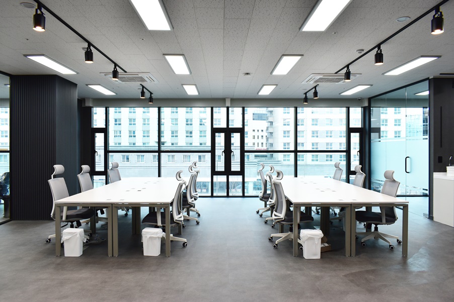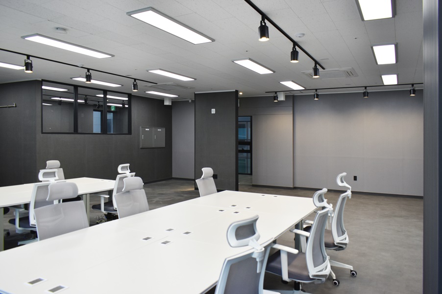 공용 사무실 공간의 모습입니다. 깔끔한 모던 그레이 인테리어로 진행하였으며 천장에 레일조명으로 포인트를 주었습니다.