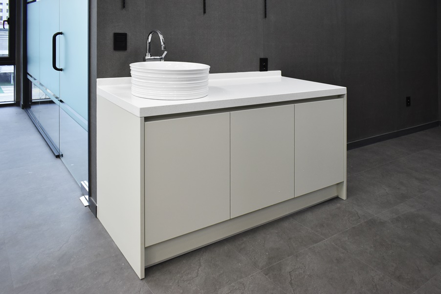 세면대는 깔끔한 화이트 디자인에 수납공간을 더하여 실용성을 높였습니다. 짙은 컬러를 사용한 공간에 돋보이는 모습입니다.