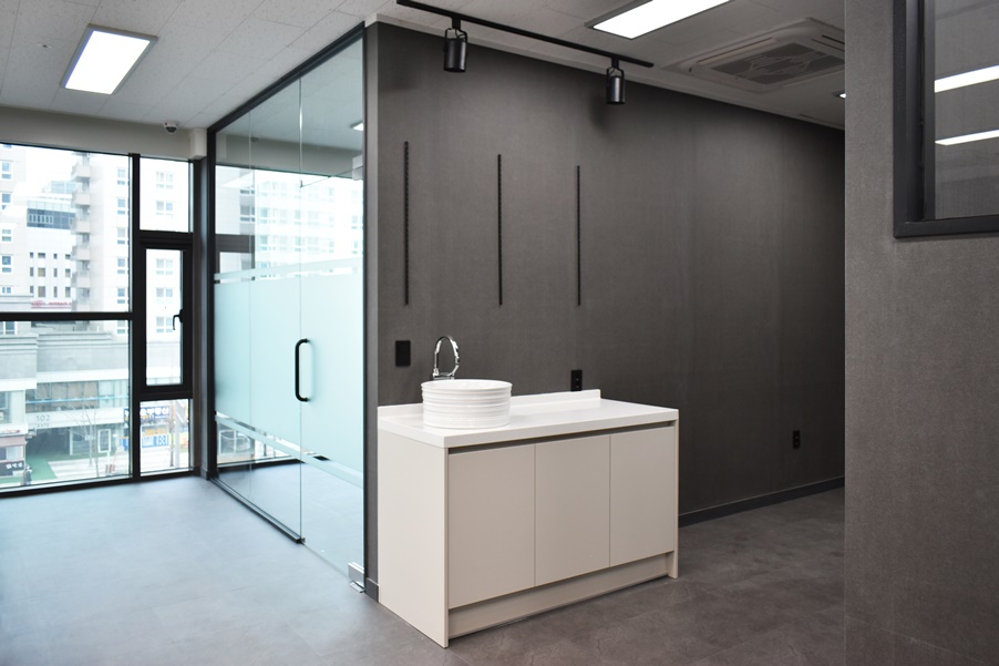 공용 사무 공간 한쪽에는 세면대를 설치하여 실용성을 높여 드렸습니다. 이 공간에 포인트를 주기 위해 위에 길이를 맞춘 레일조명을 설치하였습니다.