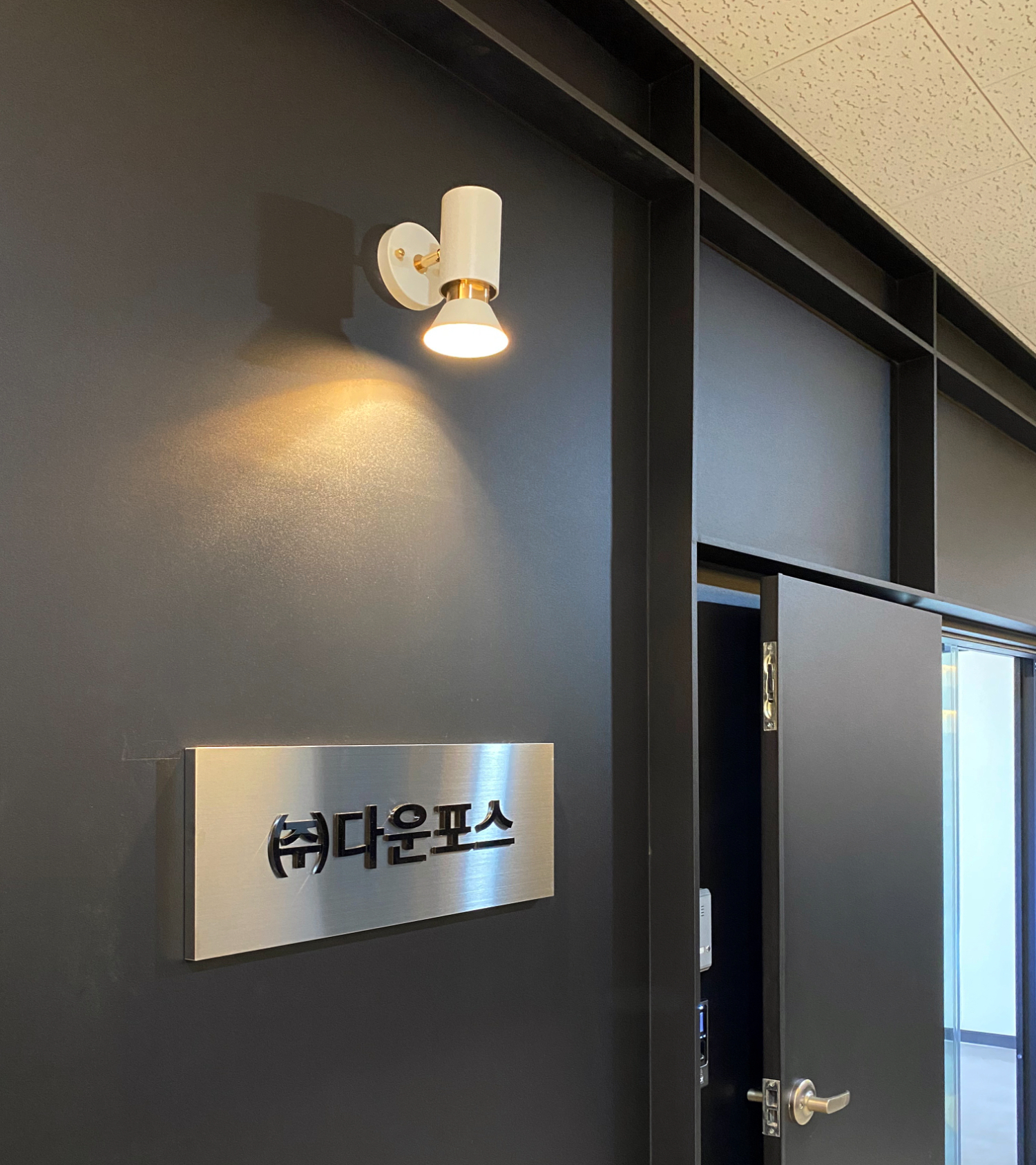 양쪽에는 각각 회사 로고가 부착되어있으며 상단에 벽등이 그곳을 밝혀주며 기업의 정체성을 확연히 드러내고 있습니다. 그리고 도어까지 전체 같은 색으로 도장하면서 통일감을 주고 무게감 있는 분위기를 보여주고 있는데요.