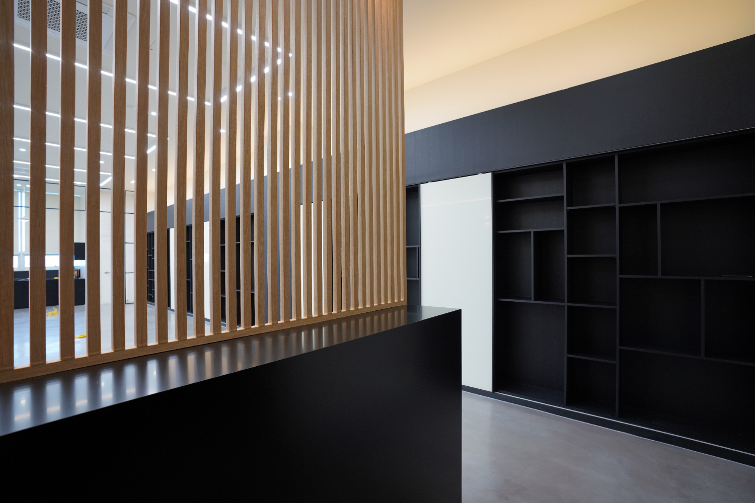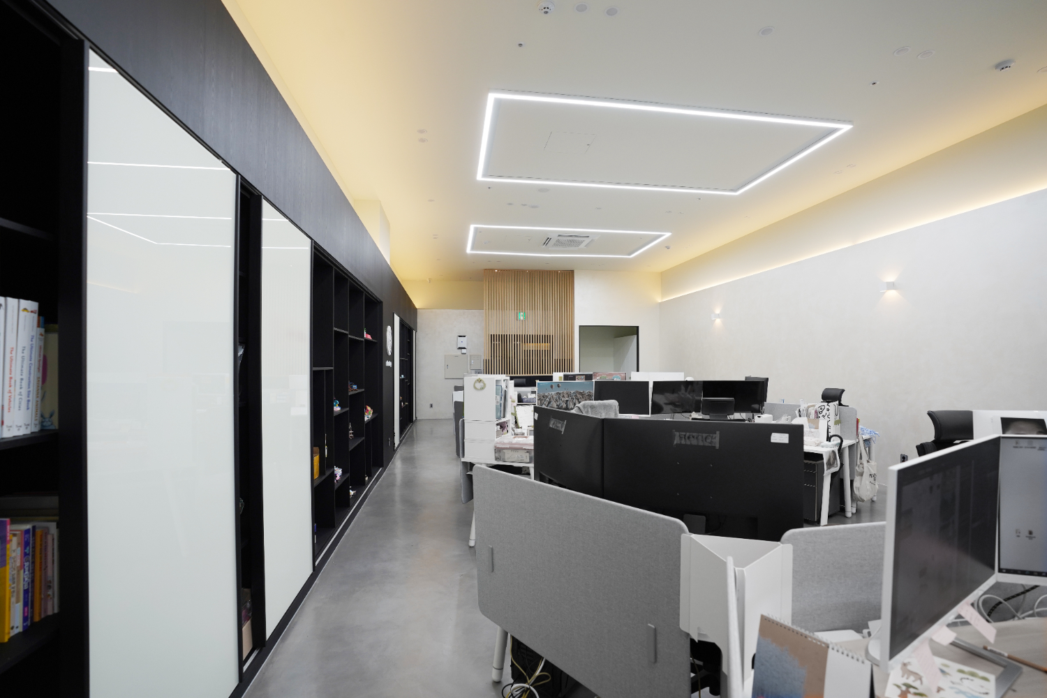 이번에 의뢰를 해주신 공간은 길게 통으로 나있는 곳이었고 별도의 룸을 만들기보다는 다함께 일하면서도 가벽을 활용한 분리를 시도했는데요. 공간의 활용도를 높이기 위해서 오른쪽의 벽은 전체 수납장으로 제작하면서 인테리어적으로나 실용성으로나 놓치지 않도록 설계하였습니다.