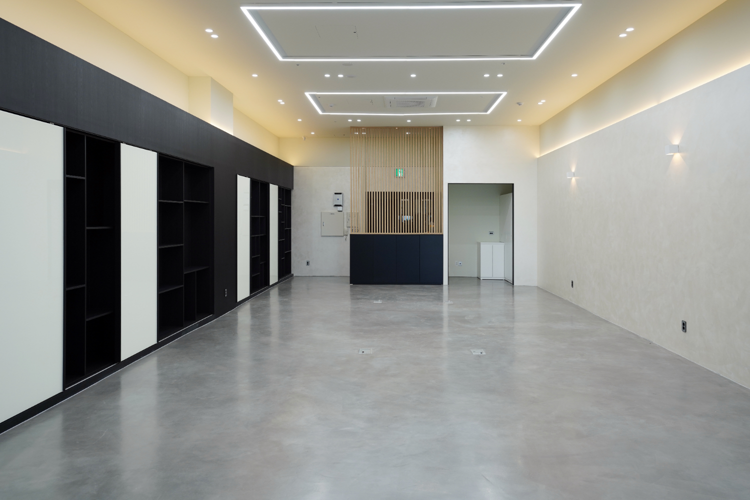 남양주 의정부 다산 지식산업센터인테리어 오피스의 모습입니다. 우선 바닥은 그레이색 시멘트 느낌으로 시공하였으며 일반 타일이나 장판이 아니기에 이음새가 잘 보이지 않아 공간의 통일성을 강조할 수 있습니다. 좁은 곳일수록 이음새가 보이면 더욱 좁게 느껴질 수 있기 때문입니다. 양쪽 벽의 단차에는 조명을 매립하여서 시야를 밝혀주었고 라인 조명을 사용하였습니다.