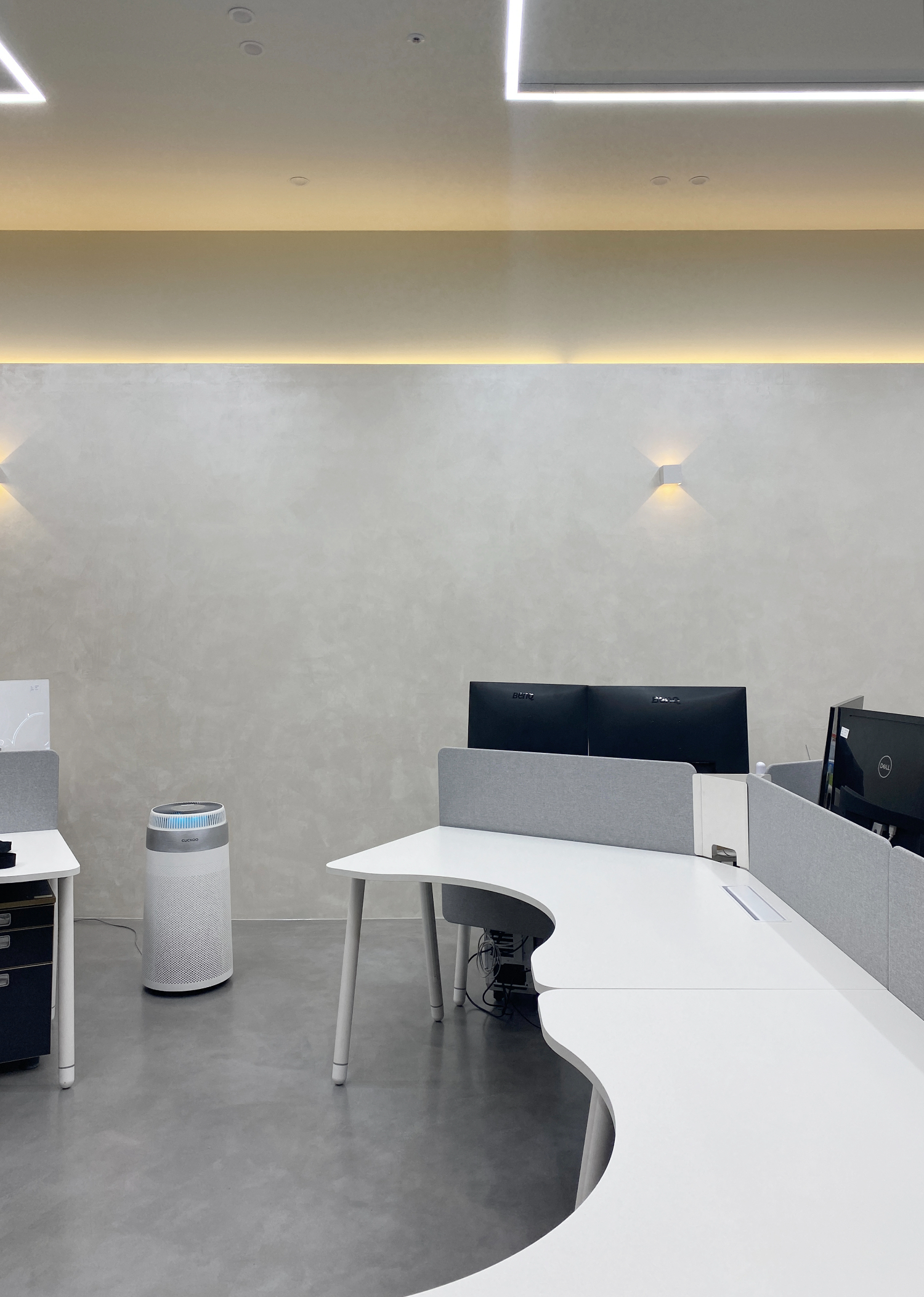 남양주 의정부 다산 지식산업센터인테리어 오피스는 세련된 느낌을 강조하기 위해서 일반 도장이 아닌 벽도 시멘트 느낌으로 시도해보았는데요. 마치 감성 인테리어 느낌을 주기도하고 너무 밋밋하지 않아서 벽 자체로 포인트가 되기도 합니다. 또한 벽에 부착되어있는 led 조명등이 은은한 포인트로 세련된 연출을 도와주고 있습니다.