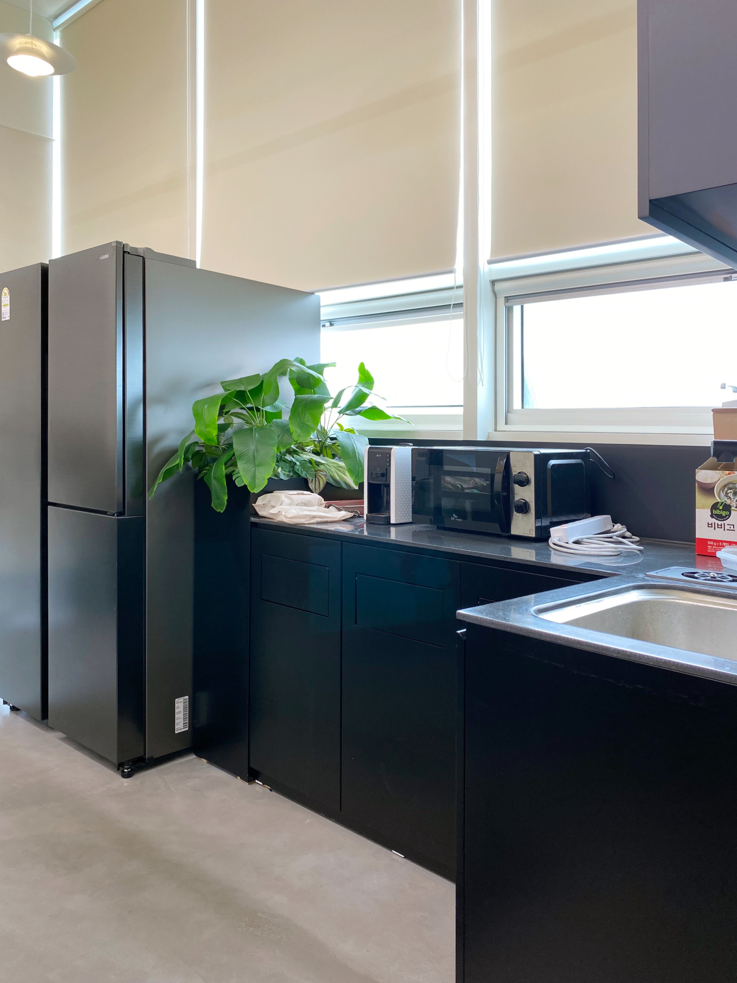 제일 안쪽으로는 간단한 탕비실과 식사공간을 만들어 휴식할 수 있게 도와드렸는데요. 클라이언트분께서도 워라밸의 중요성을 강조하셨기 때문에 지친 업무 도중 탁 트인 창문 밖을 바라보면서 휴식을 하실 수 있게끔 디자인을 제안드렸어요. 그리고 모서리에 책꽂이로도 쓸 수 있는 파사드로 독특한 효과를 주었으며 전체 블랙으로 색감의 통일도 이뤄넀습니다.