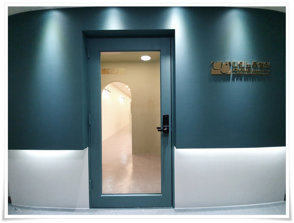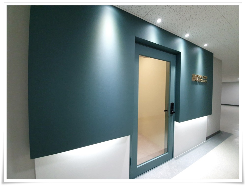 사무실의 출입문의 모습입니다. 화이트톤의 깔끔한 외벽이 구성이 되어있는 가운데 출입문은 기업의 상징적인 색을 청록색을 이용해서 배치가 완료되어 있습니다. 이는 찾아오는 고객들로 하여금 더 눈에 잘 띄게 만들어서 호감적인 느낌을 잘 받을 수 있도록 디자인을 시도했습니다.