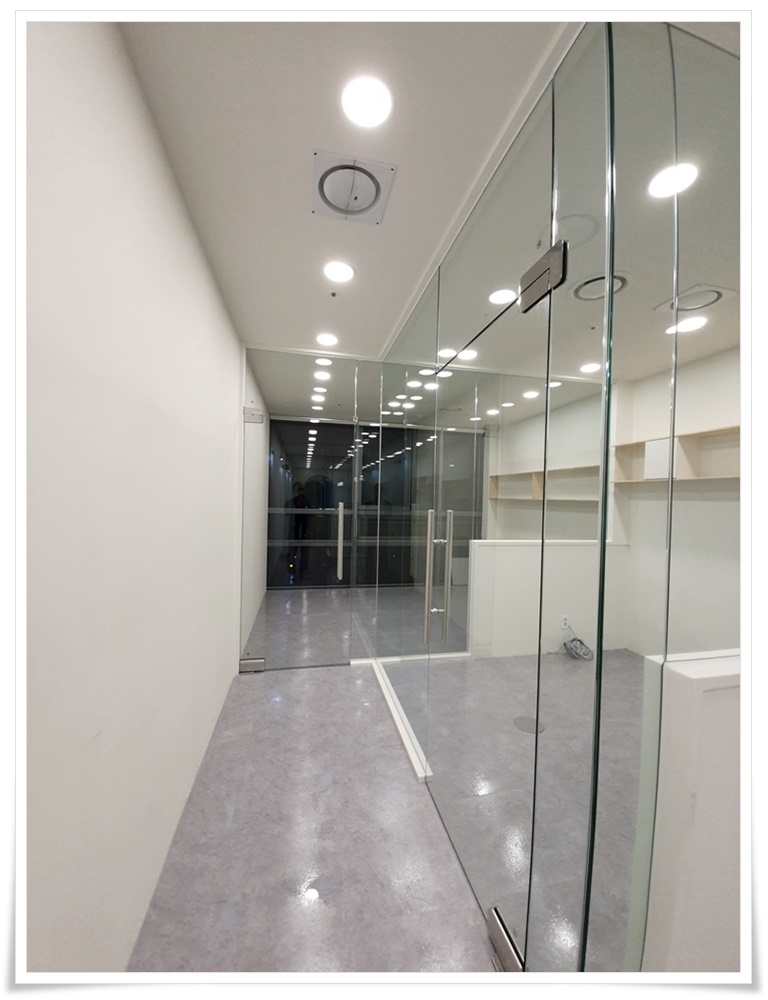 사무실의 모습입니다. 아까 보여드린 ISO와는 다르게 출입문을 열고 들어와서 보이는 내부공간이 청록색을 띄고 있지 않으며 깔끔한 타일공사와 기업의 로고를 박은 인테리어로 탈바꿈하였습니다. 이는 시공현장에서 너무 과한 요소일 것이라고 생각하여 고객과의 조율을 통해서 완성한 저희의 노력이기도 합니다.