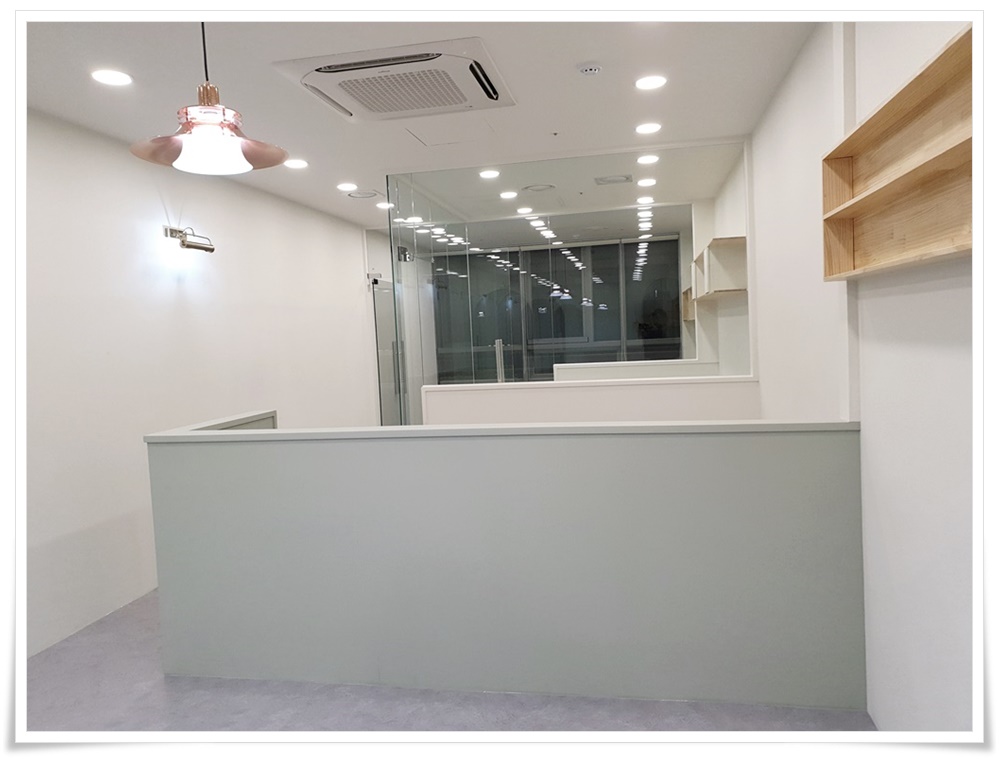 사무실의 전경입니다. 좁은 법률사무소임에도 불구하고 저희는 이러한 부분을 길고 깔끔한 인테리어 구성을 통해서 디자인해보았습니다. 전체적으로 화이트톤의 색감을 이용한 인테리어가 눈에 띄며 아래 외벽같은 경우에는 몰딩을 이용해서 조금 더 깔끔하고 우아한 분위기를 형성해보았습니다.