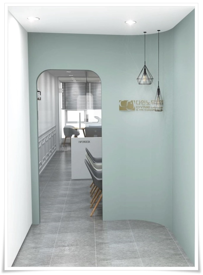 출입문을 열고 출입문을 열고 들어오면 이처럼 깔끔한 분위기의 인테리어 배치가 되어있을 것입니다. 이 부분은 법률사무소에 들어오는 고객들이 가장 먼저 마주치는 공간이기에 저희는 청록색을 이용해서 이 부분을 강조하였습니다.