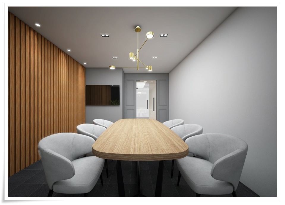 회의실은 외부 그레이를 내부에도 활용해 차분하면서 중후한 분위기를 조성하게 했고 한쪽 벽면은 우드를 적용해 포인트가 되면서 소재의 통일성을 줬으며 화려하지만 조도가 좋은 팬던트형 조명을 시공해 고급스러우면서 집중력이 높아지도록 했습니다.