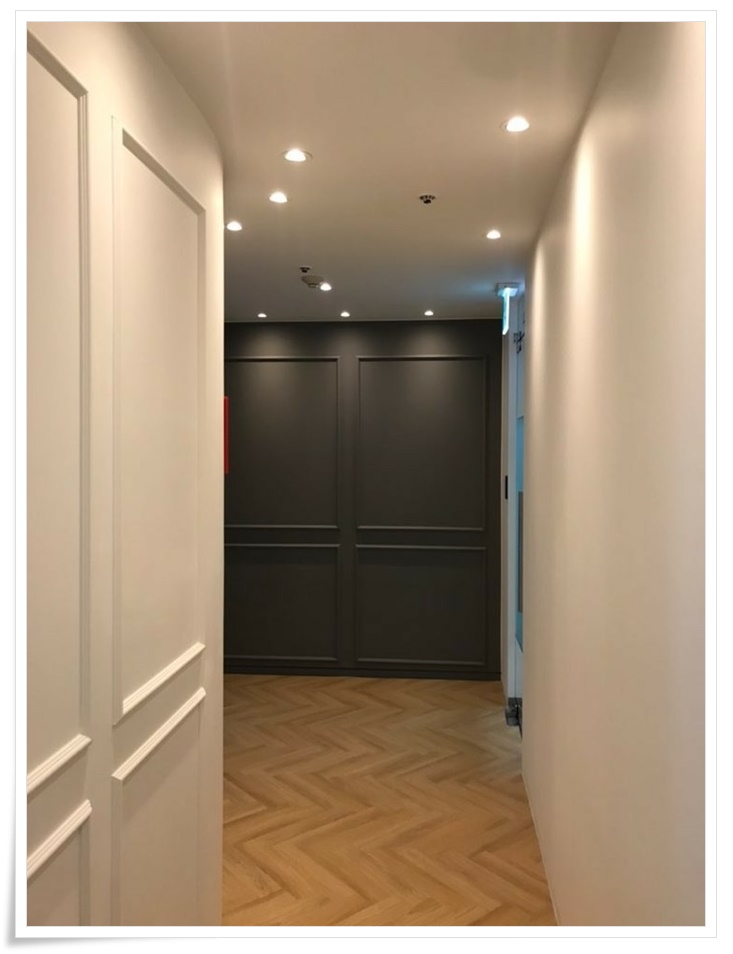 입구를 들어가면 복도라인이 있는데요, 그레이 벽면을 따라 직진을 하면 회의실로 진입하고 화이트 벽면을 따라 왼쪽으로 진입하면 사무 공간으로 진입할 수 있습니다. 웨인스코팅과 원목 마루는 목공 작업을 통해 시공이 되고 다산 블루웨일 회사 오피스 인테리어, 사무실시공비용은 높아지게 하는 항목 중 하나가 되는데요, 특히 시공법이 까다롭고 시간이 오래 걸리는 헤링본패턴은 비용을 높이는 큰 요소가 되죠.