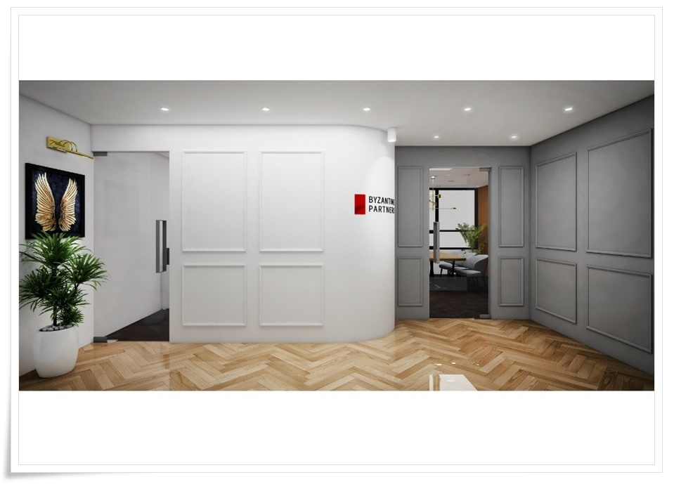 궁근 벽면에는 화이트와 대비되는 뚜렷한 블랙과 레드로 제작한 회사명과 로고를 부착해 회사의 정체성과 가독성을 높였습니다. 사무 공간 내부는 화이트와 그레이로 벽면과 바닥을 마감해 균형 잡힌 공간으로 조성했고 나무 간살을 시공해 대표님 공간을 분리했습니다.