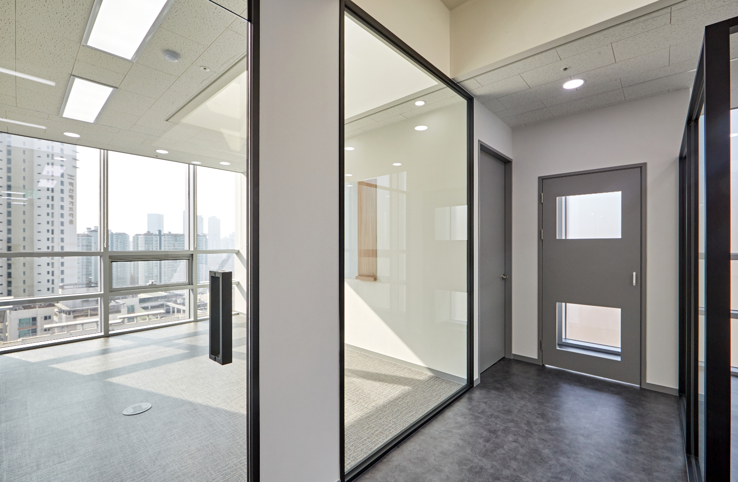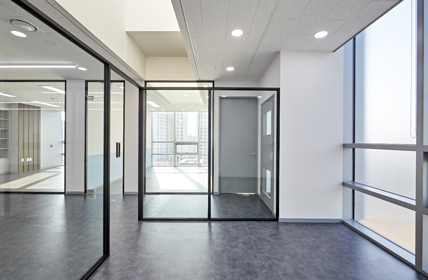 사무실 내부는 화이트 인테리어에 글라스월로 개방감을 주면서 동시에 블랙 프레임으로 깔끔하게 공간을 구분해준 모습입니다. 여러개의 공간으로 구성을 하는만큼 적극적으로 개방감을 주어 답답한 느낌을 해소 시켰습니다.