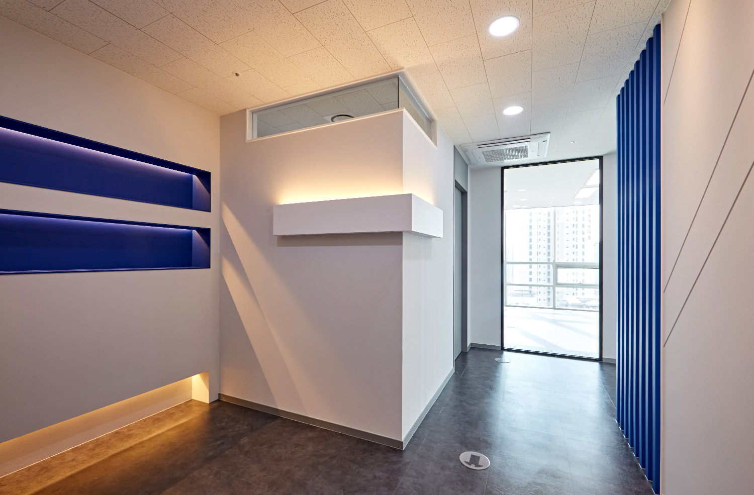 외부 파사드와 입구에는 기업의 이미지를 표현한 블루 컬러로 포인트를 주었고 심플한 디자인으로 신뢰감이 느껴지는 공간으로 구성 했습니다.