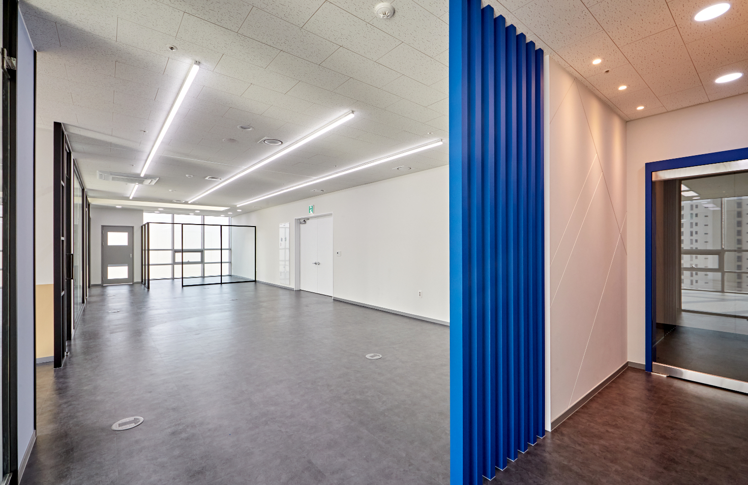 입구 공간과 사무실 내부는 블루 컬러의 우드 파티션으로 가볍게 구분해주었습니다. 파티션을 설치해 복도를 길게 만들어 공간이 더 길어보이는 느낌을 주었습니다.