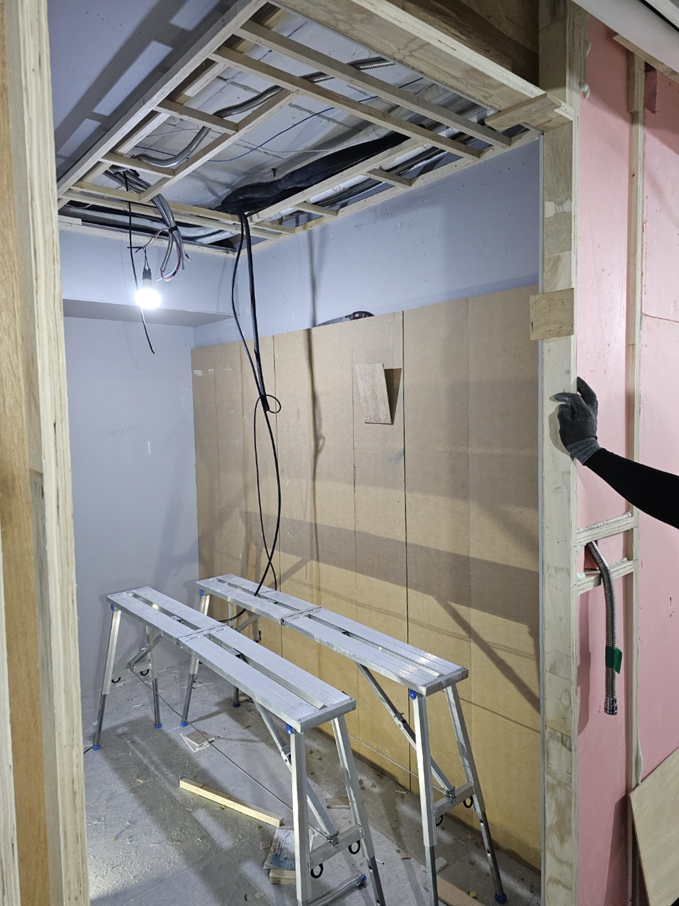 목공 작업은 원형 곡선 벽체를 위한 합판 및 목재 프레임을 설치하였습니다.