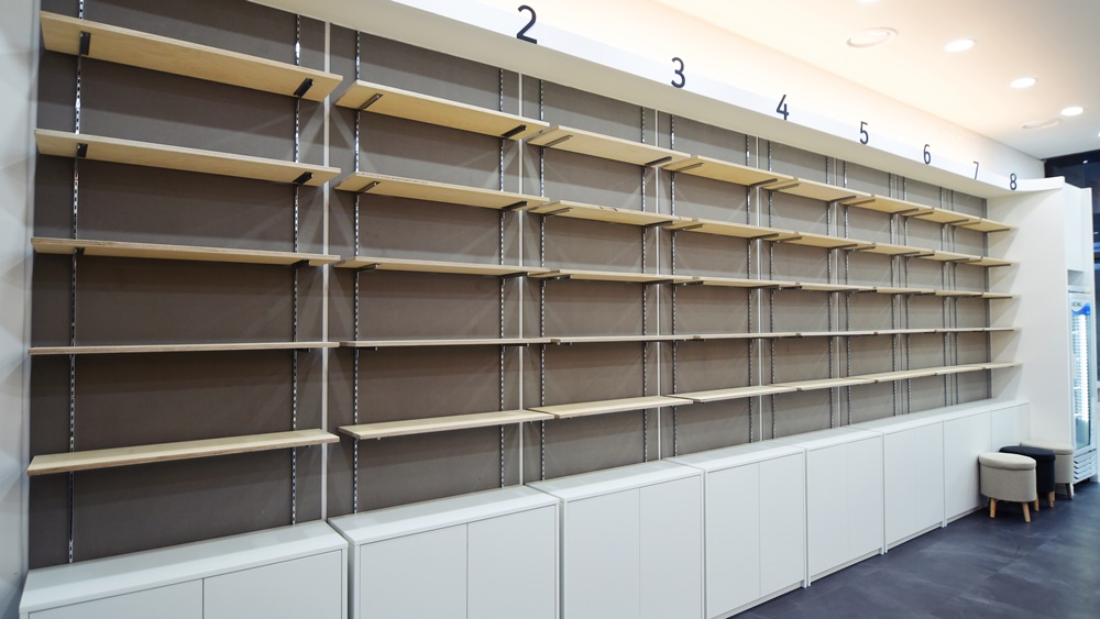 카운터 뒤에 수납공간을 마련하거나, 벽면에 디스플에 공간을 설치하는등의 방법을 고려할 수 있습니다.