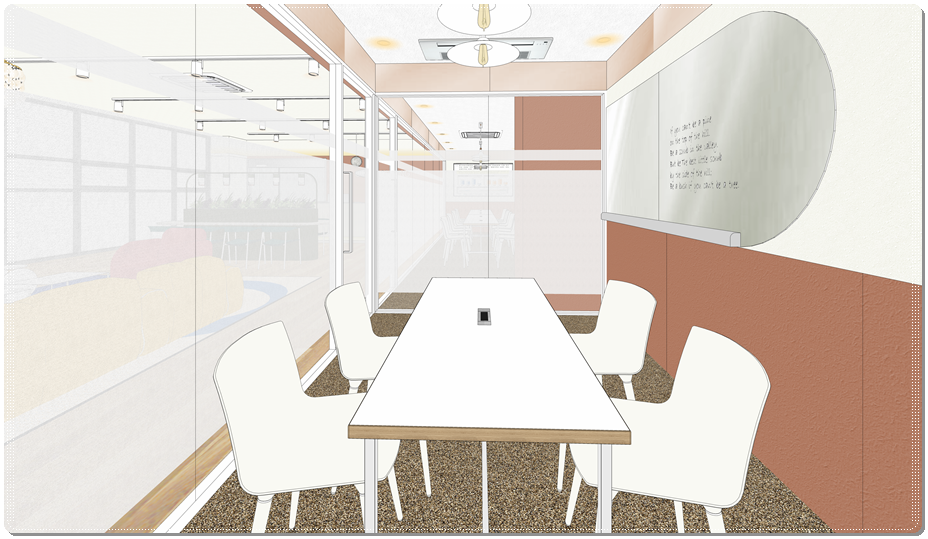 가벽으로 완벽히 분리된 회의실입니다. 외벽을 제외한 모든 벽면을 유리 가벽으로 계획해 개방성과 연장성을 부여함으로써 확장된 하나의 공간처럼 느껴져 답답하지 않고 쾌적한 느낌이 들도록 했습니다. 벽면은 화이트를 메인으로하고 하단을 분리해 우드톤이나 그레이톤으로 컬러를 다르게 해 안정감을 주었고 메인 조명은 눈이 피로하지 않은 색감을 사용했으며 벽면에 미러보드를 시공해 공간을 넓어 보이게 하면서 편의성도 높였습니다.