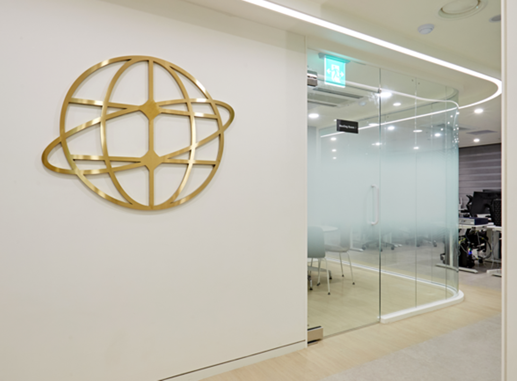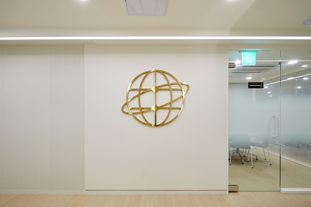 화이트 컬러 벽면 위에 기업의 정체성을 상징하는 골드 메탈 사인물을 설치해 심플하면서도 고급스러운 인상을 주었습니다.