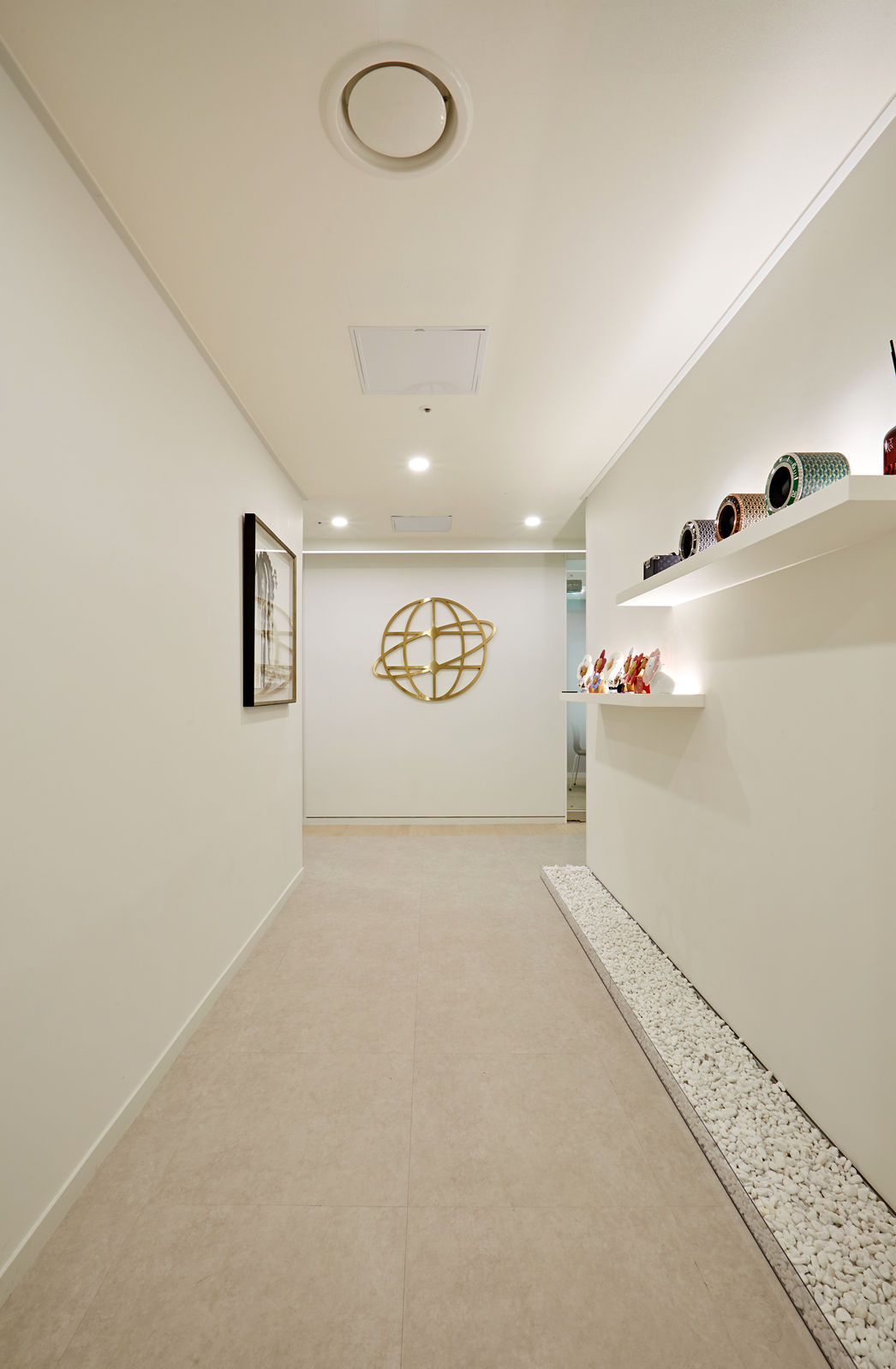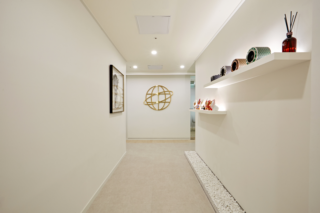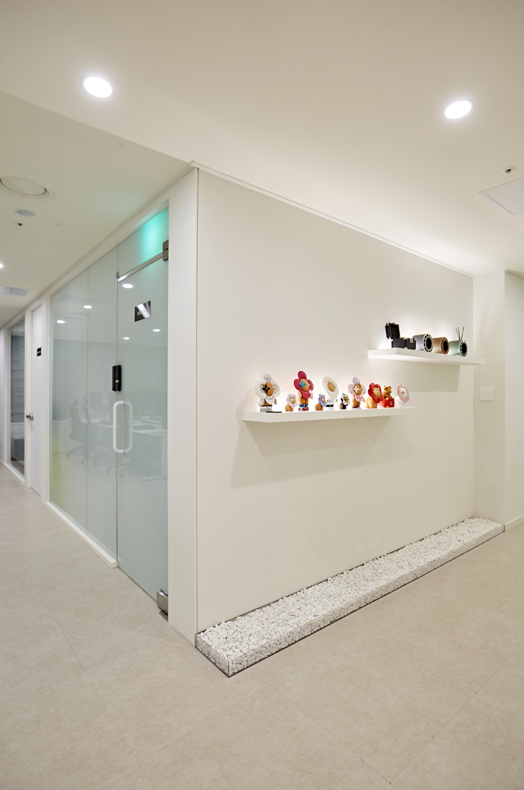 벽면에는 심플한 선반을 설치해 기업과 관련된 아트 오브제, 소품, 디퓨저 등을 배치하고