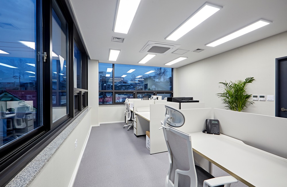 와이드한 통창을 통해 들어오는 채광을 살리면서, 천장에는 메인 라인 조명과 보조 매립등을 조화롭게 배치해 그림자 없는 밝은 환경을 조성했습니다.