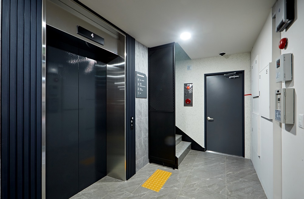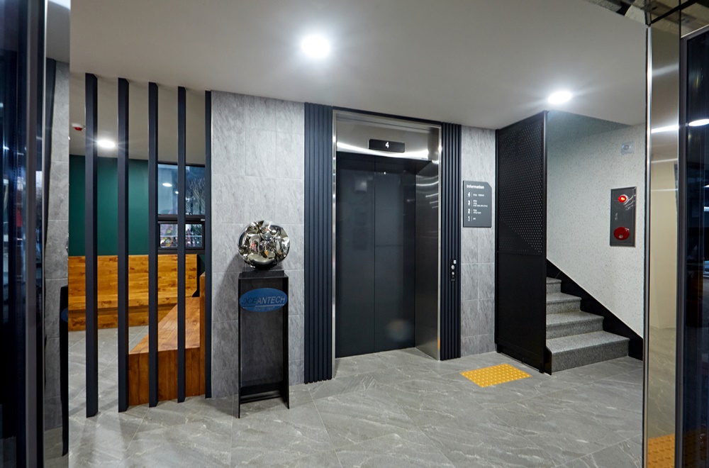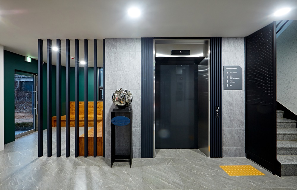 엘리베이터에서 내리자마자 마주하게 되는 이 공간은 컬러의 힘이 가장 극명하게 드러나는 곳입니다.