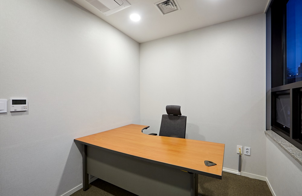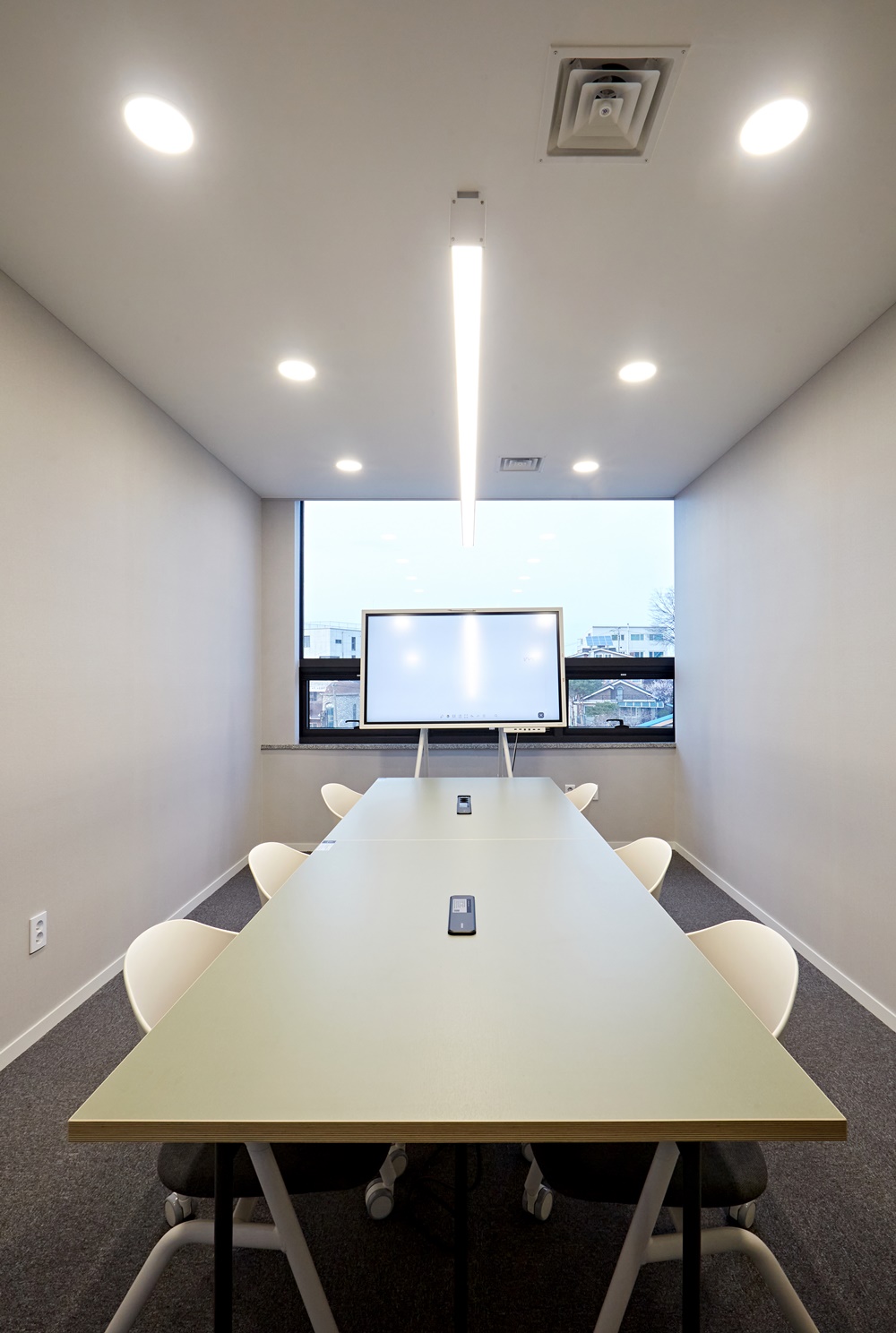 소규모 팀 미팅이나 외부 업체와의 미팅을 위한 소회의실은 차분한 그레이와 화이트 톤으로 마감하여 집중도를 높였습니다.