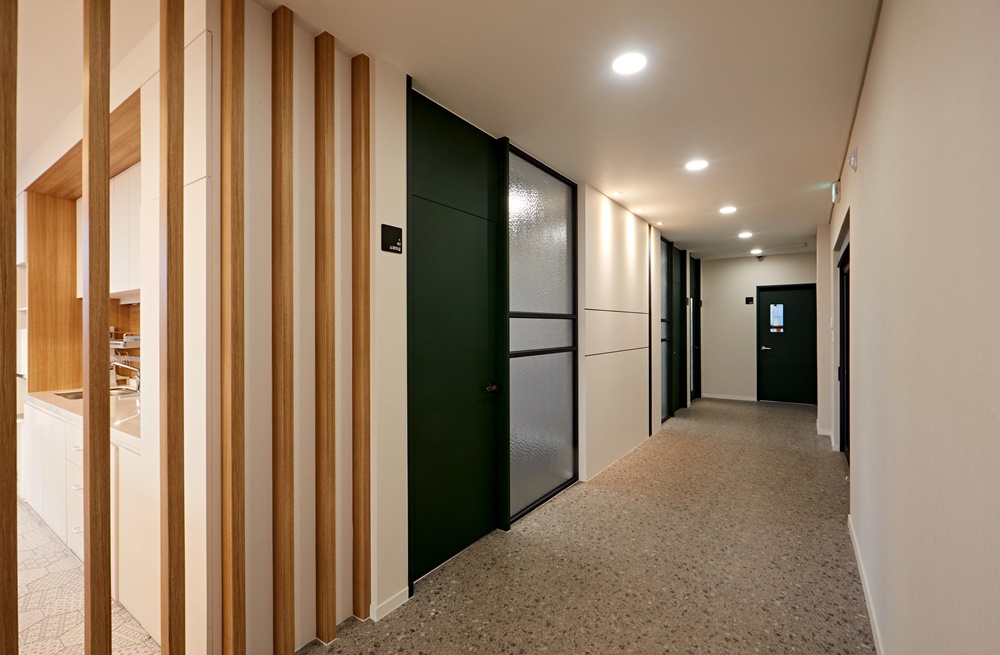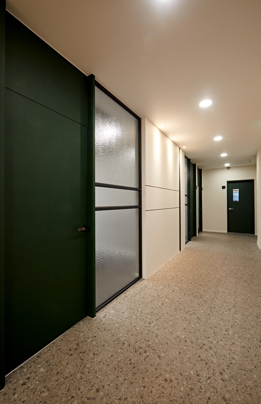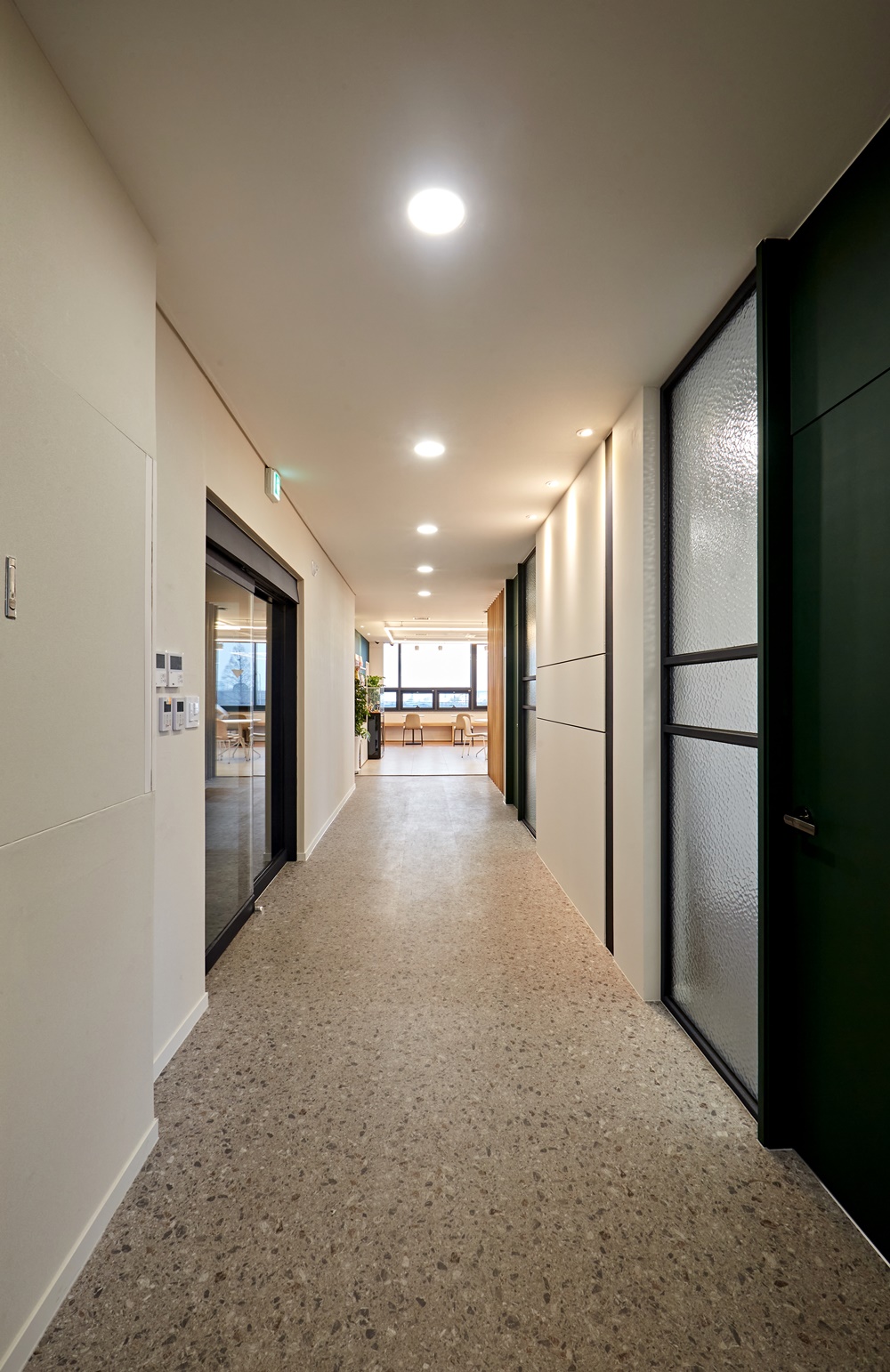 복도를 따라 이동하면 나타나는 미팅룸과 사무 공간 역시 딥그린 도어와 유리 파티션을 활용해 통일감을 주었습니다.