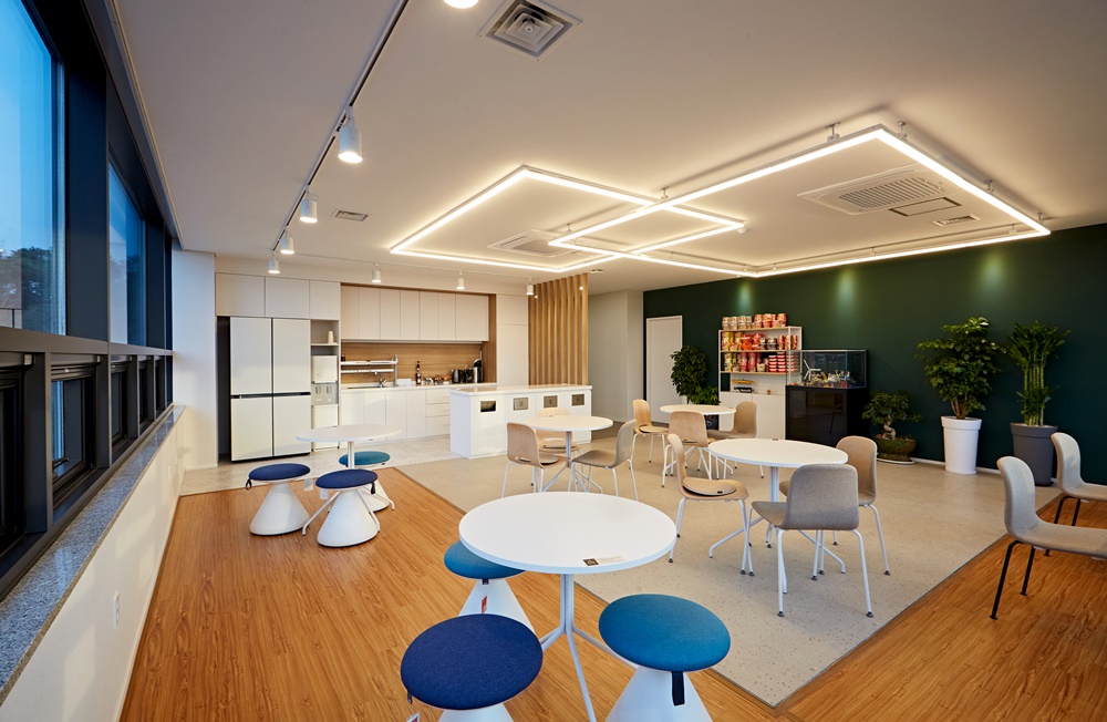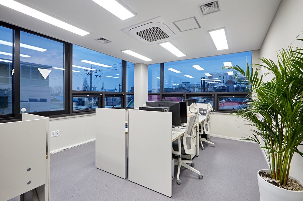 천장의 매립등과 라인 조명이 사무실 전체를 밝게 비추어 활발한 아이디어 공유가 일어날 것만 같은 분위기죠.