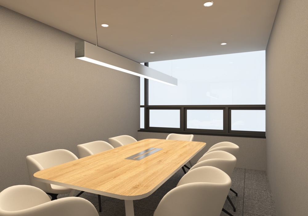 공간이 좁아 보이지 않도록 슬림한 화이트 미팅 테이블을 중앙에 배치하고, 천장에는 일자형 펜던트 조명을 낮게 떨어뜨려 아늑한 분위기를 조성했는데요.