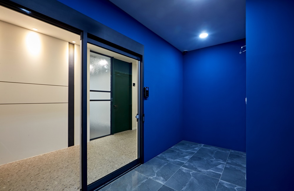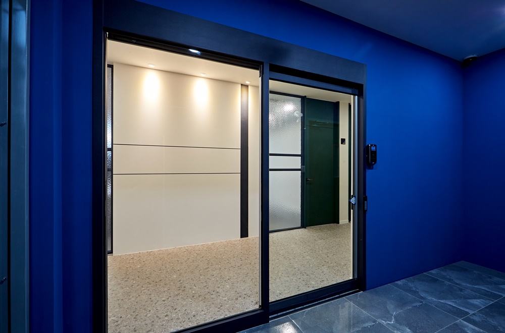 일반적인 복도의 단조로움을 깨뜨리는 이 블루 게이트는 전문성과 신뢰감을 상징하며, 바닥의 다크 그레이 대리석 타일과 조화를 이뤄 묵직한 고급스러움을 자아냅니다.