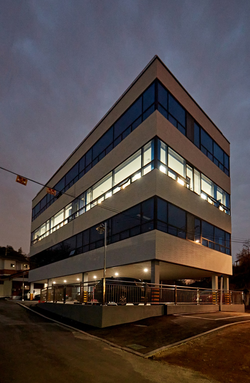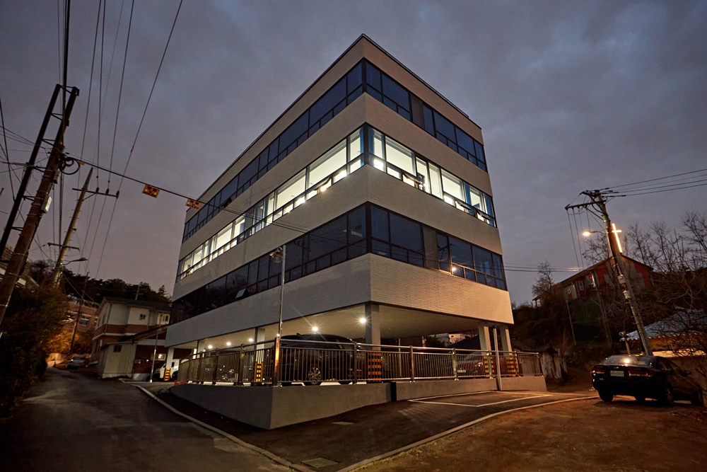 외부에서 건물을 바라보았을 때도 내부의 라인 조명과 딥그린 벽면이 창을 통해 은은하게 비쳐 보여, 건물 전체의 품격을 높여주는 효과를 거두었답니다.
