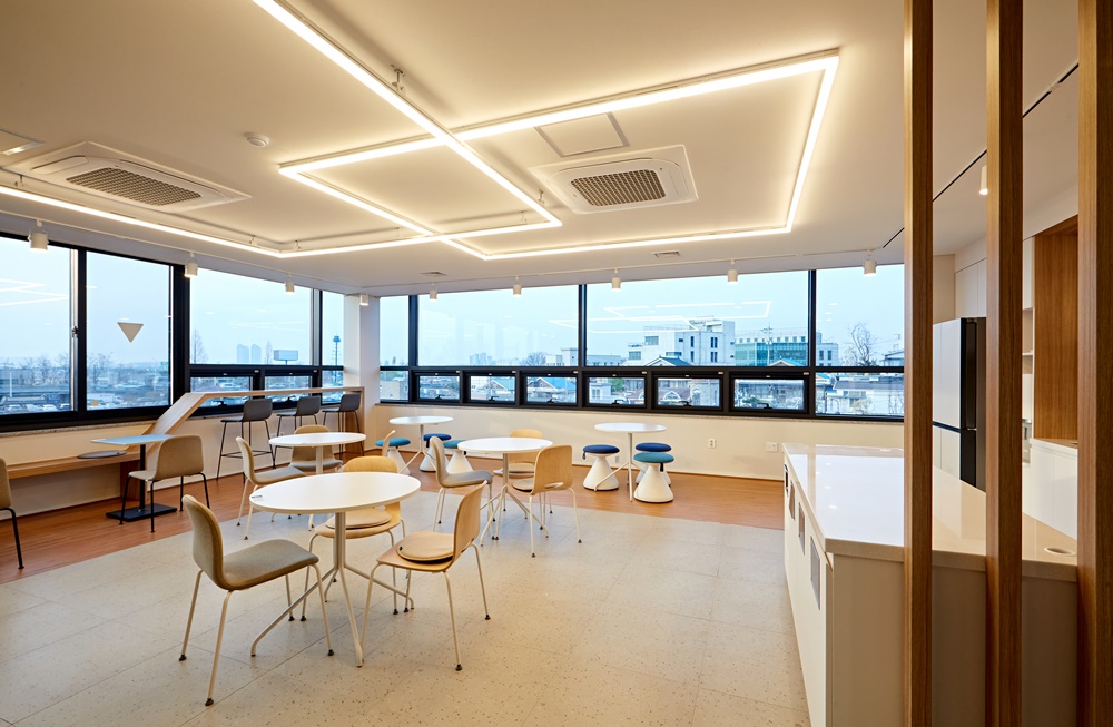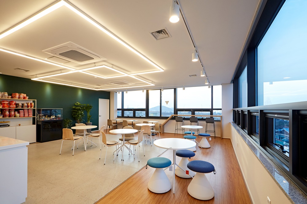 이곳에는 모듈형 수납장과 선반을 제작하여 간식이나 비품을 깔끔하게 정리할 수 있도록 했으며, 화이트와 우드가 섞인 테이블 세트를 배치해 카페 같은 휴식 공간을 조성했습니다.
