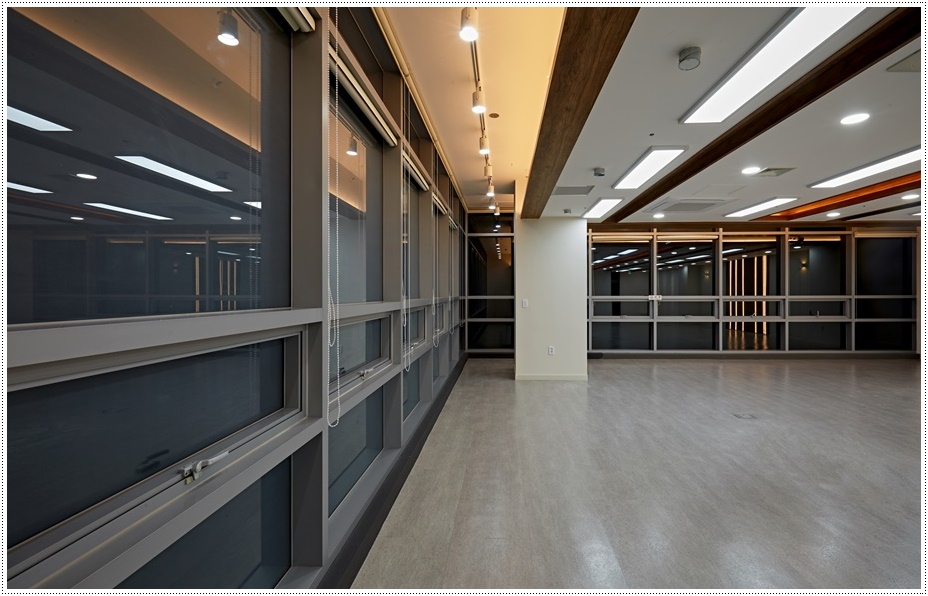 로비에서 오른쪽으로 돌아 들어가면 공용 사무실이 있습니다. 통합형으로 시공한 사무실로 조직 개편, 증원 등에 유리하고 공간을 다양하게 활용할 수 있으며 업무 효율에 도움이 되고 있어 최근 많이 시공되는 사무실형태입니다. 외부 파사드-내부 파사드로 이어진 간살 디자인의 아트월이 공용 사무실 벽면에도 시공되면서 인테리어 통일성을 이루고 있습니다. 전체적으로 화이트로 마감하고 천장에 넓은 두께의 라인 조명과 매립형 조명을 시공해 충분한 조도를 확보했습니다.