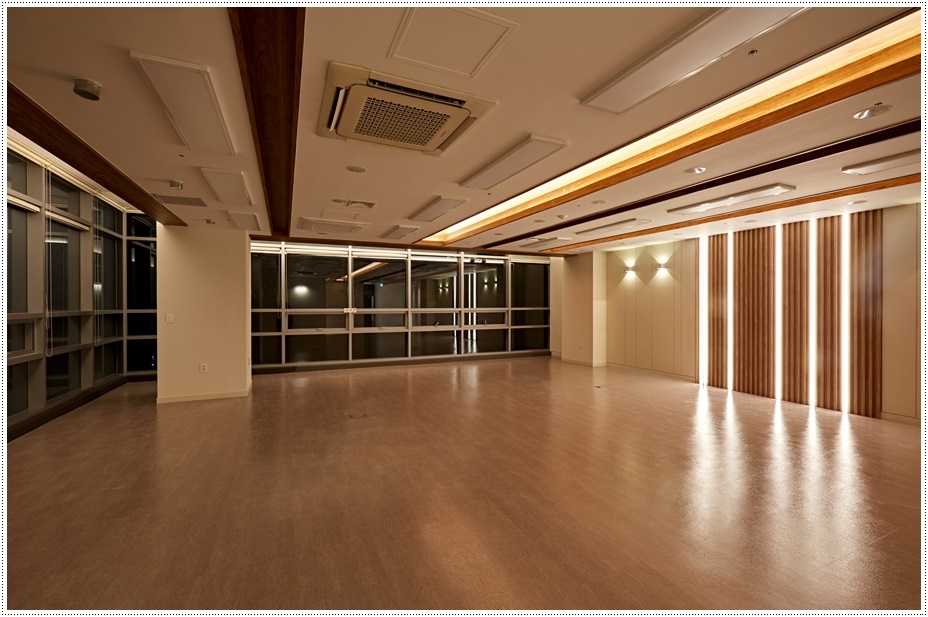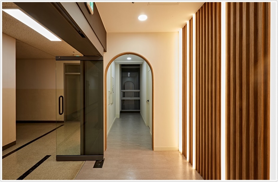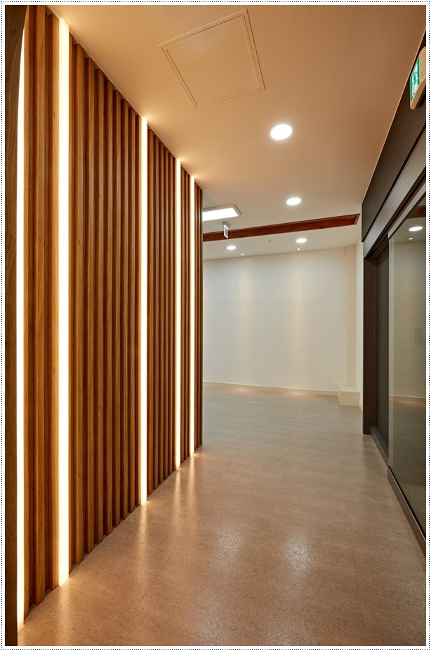 외부 파사드입니다. 화이트 & 우드의 디자인에 조명이 더해져 야간에도 멋진 첫인상을 뽐내고 있습니다. 특히, 우드 간살 디자인이 적용된 파사드는 고급스러우면서 클래식한 느낌이 드는데 화이트톤의 조명빛이 더해지니 모던한 세련됨이 연출됩니다. 도어는 유리로 시공해 우드 간살 디자인으로 시공된 내부 파사드가 외경으로 어울릴 수 있도록 했습니다.