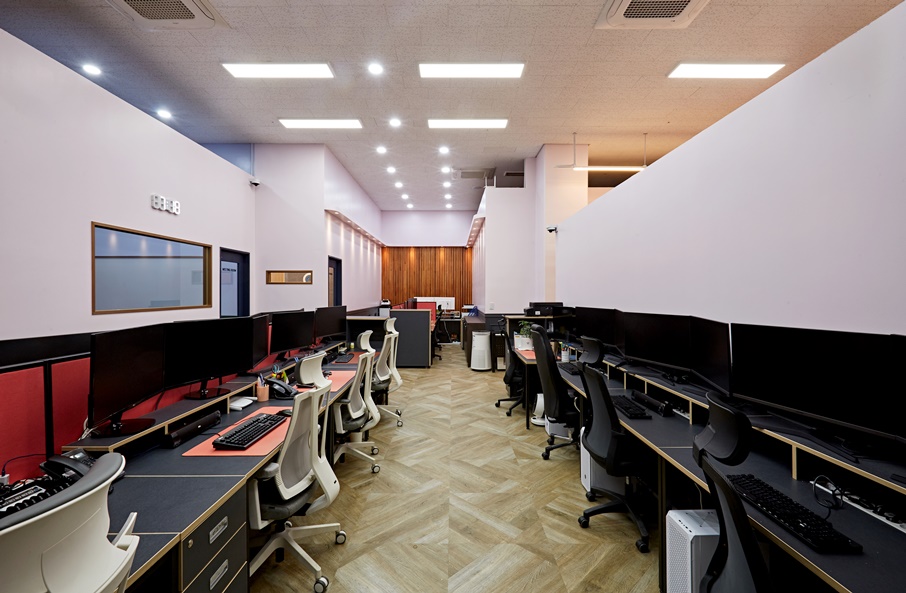 사무실의 공간은 최대한 다른 부서 및 팀들과 마찰이 일어나지 않도록, 구성을 했습니다. 간혹, 파티션을 설치하여, 부서나 팀끼리 나누는 경우들이 있지만, 이러한 구성은 오히려 공간을 폐쇄적으로 만들기 때문에, 최대한 개방적인 구조를 통해서, 서로 다른 팀이라 하더라도, 쉽게 친해지고, 빠른 시간 내 협업을 할 수 있도록 공간을 연출해주었습니다.