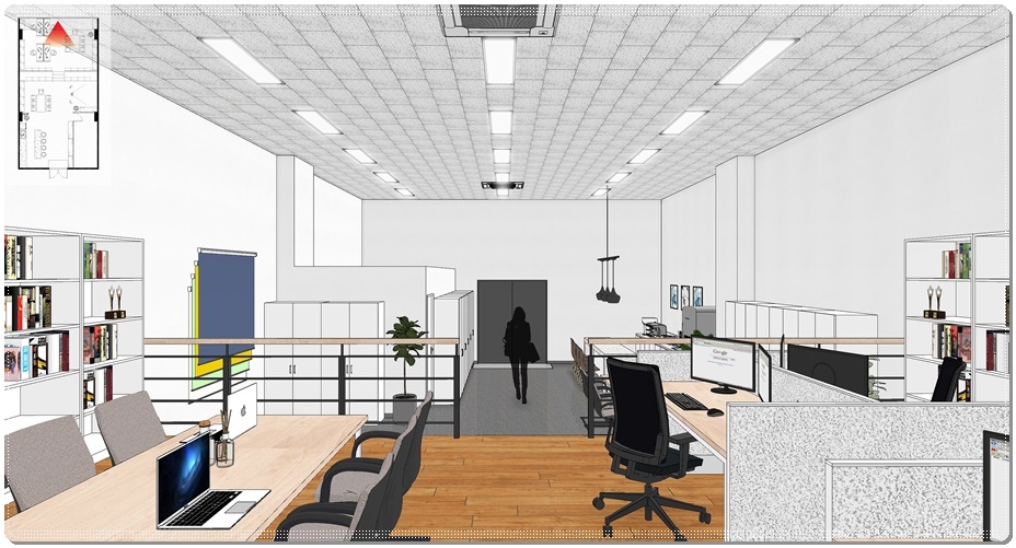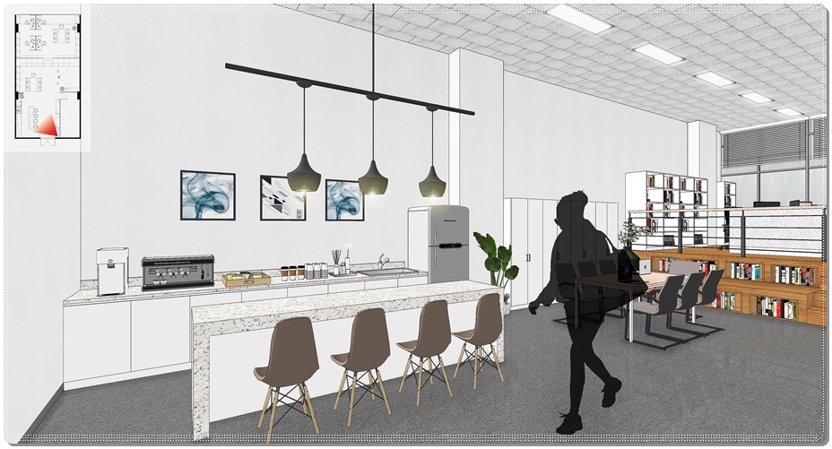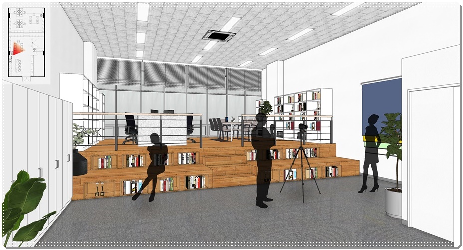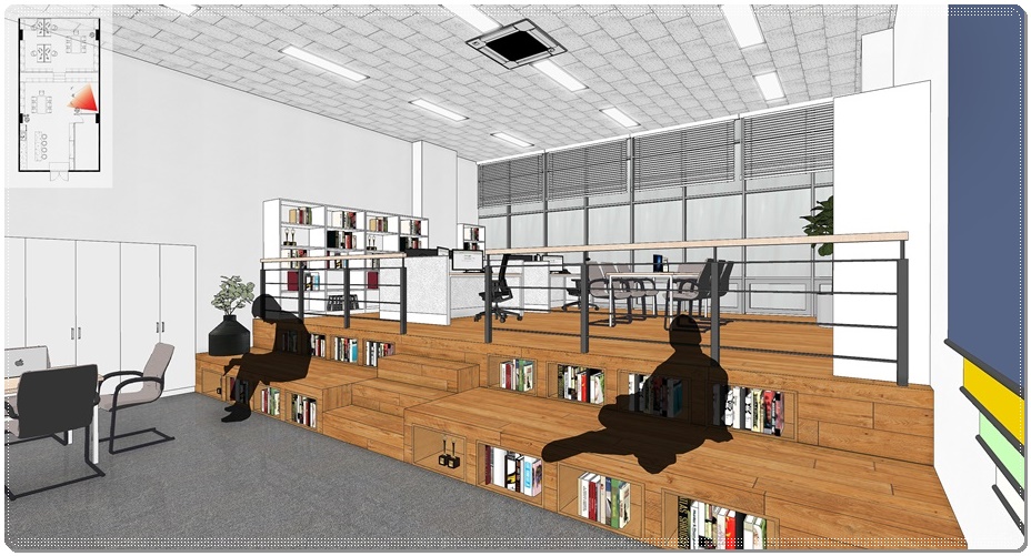 스텝업플로어링으로 단차를 높여 배치한 업무공간입니다. 앞에서 언급했듯 같은 층이지만 보이는 시선이 완전히 다르다는 것을 알 수 있습니다. 만약, 이런 모습을 평면설계도만 제공하고 말로 설명을 해드린다면 정확한 이해가 되지 않으실 수 있지만 저희는 3D 이미지를 함께 작업해 제공함으로써 사무실의 유니크한 분위기를 쉽게 이해하실 수 있도록 도와드리고 있습니다.