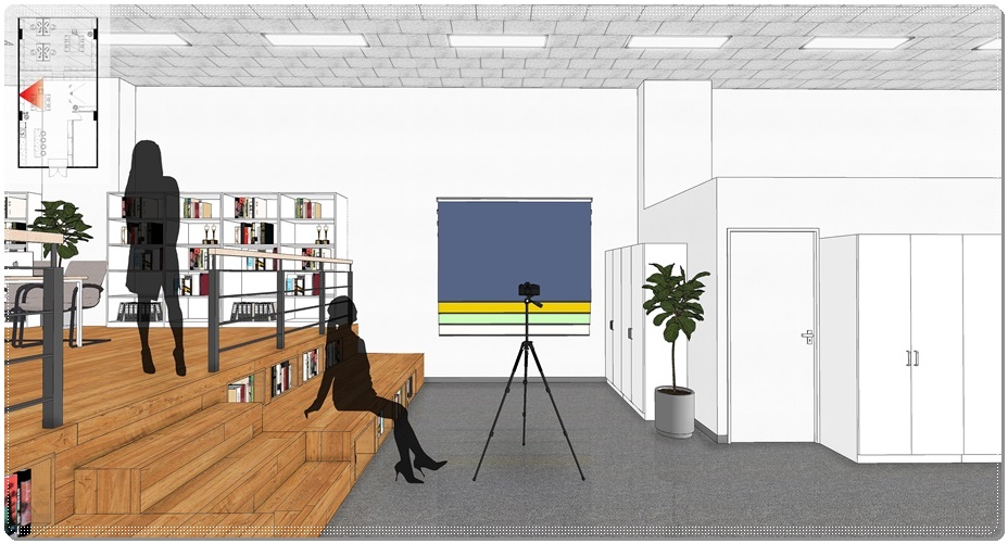 업무 공간과 독립형 공간 사이에 계획한 촬영공간입니다. 벽면에 여러 컬러의 배경을 롤스크린으로 적용하면 크로마키 영상을 비롯해 다양한 분위기의 촬영이 가능하답니다.
